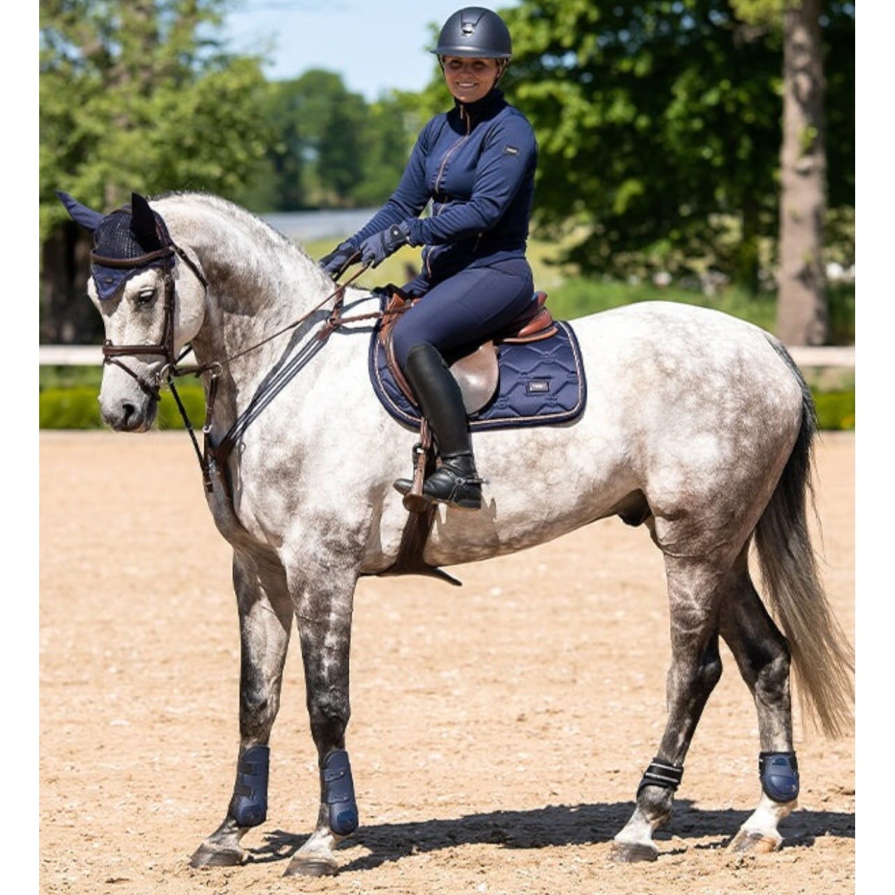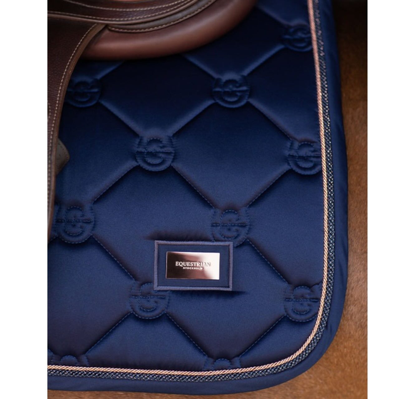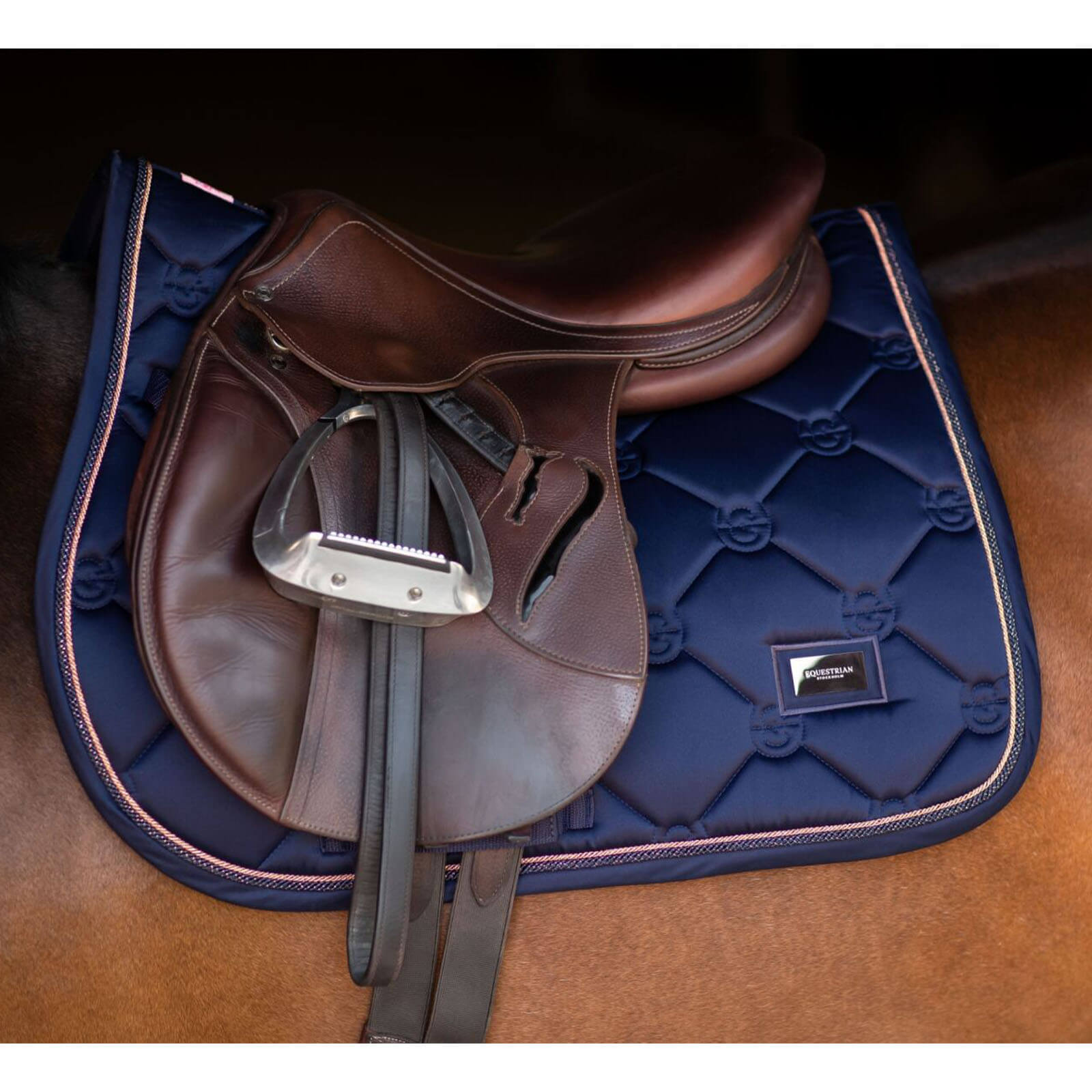 Die Springschabracke Lagoon Blush besticht durch ihr dunkelblaues Farbschema, veredelt mit roségoldenen Details und dem exklusiven Equestrian Stockholm-Abzeichen. Diese harmonische Farbkomposition verleiht deinem Pferd einen edlen Look und sorgt gleichzeitig für einen sicheren Sitz im Sattel. Perfekt für Reiter, die Wert auf Ästhetik und Qualität legen.