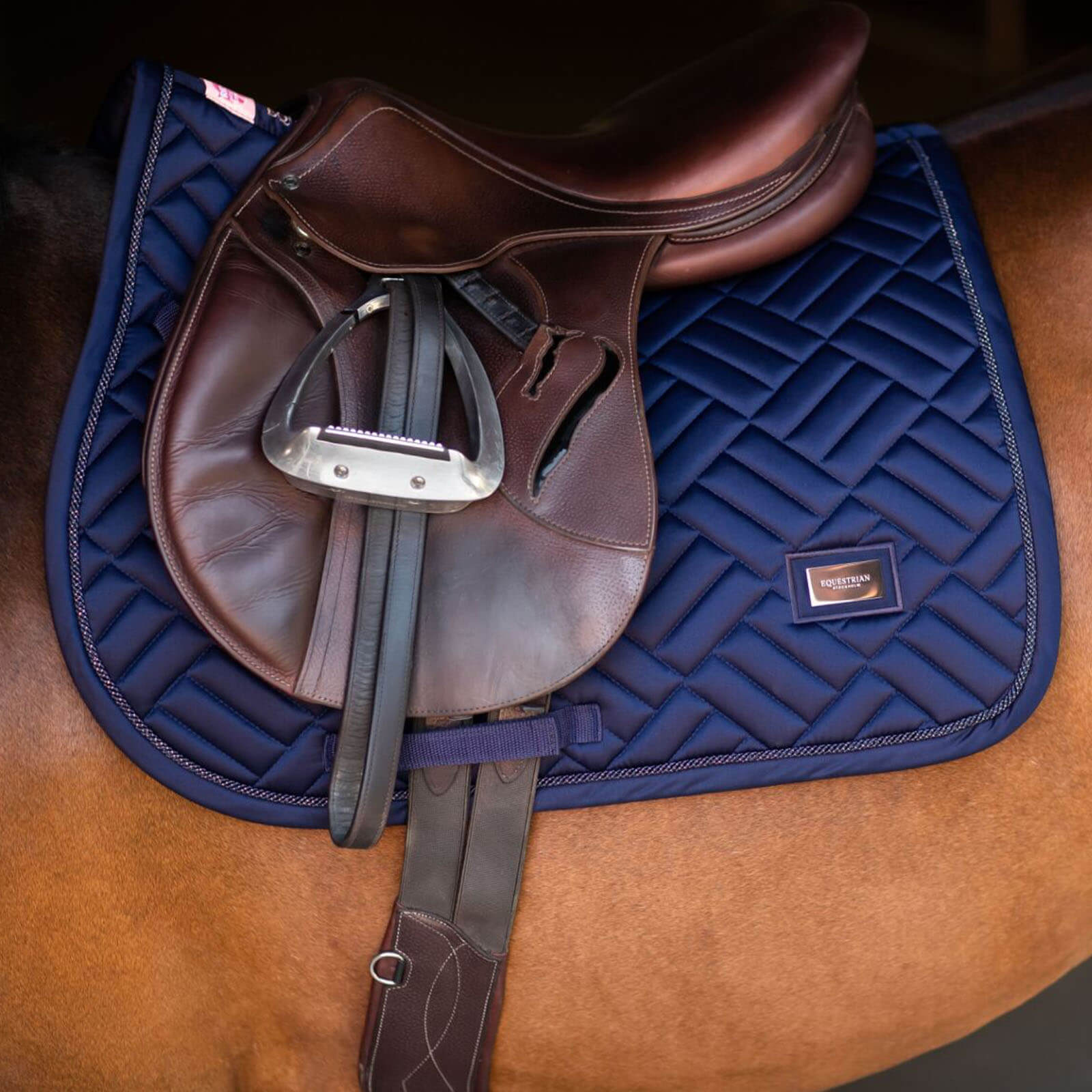 Die Springschabracke besticht durch ein modernes, labyrinthartiges Steppmuster, das in Kombination mit roségoldenen Akzenten ein echtes Highlight für jedes Reitoutfit darstellt. Das edle Equestrian Stockholm Abzeichen in Roségold verleiht der Schabracke eine zusätzliche Note von Raffinesse. Das Design ist nicht nur ästhetisch ansprechend, sondern sorgt auch für eine gleichmäßige Druckverteilung auf dem Pferderücken.