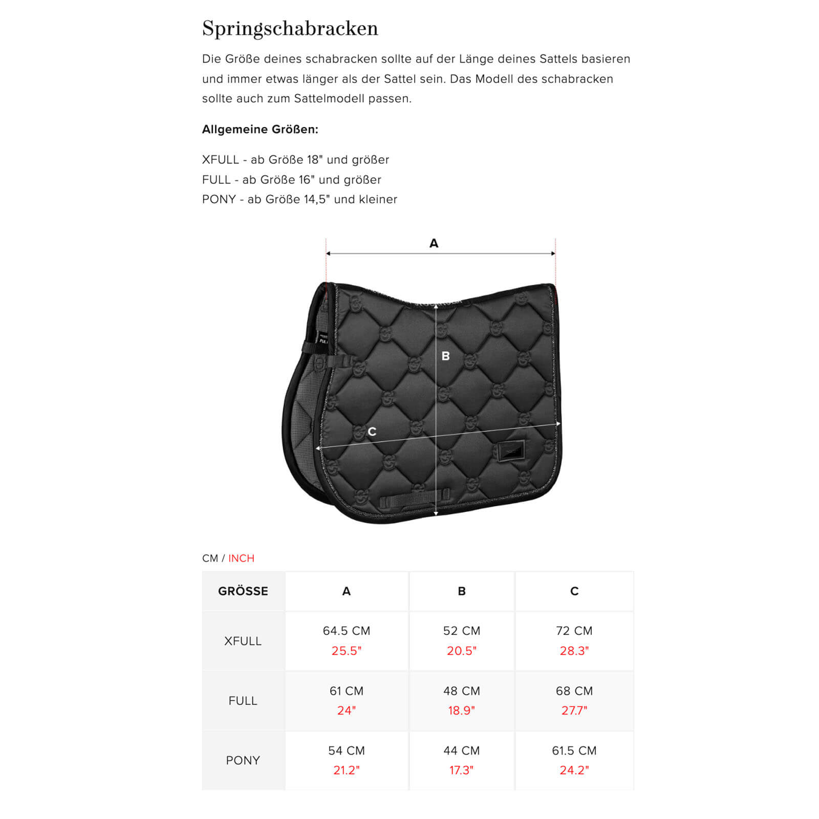 Ob beim Training oder Turnier, die Springschabracke Striking Valley ist dein idealer Begleiter. Sie ist pflegeleicht und kann bei 30° gewaschen werden. Drehe sie auf links und schließe alle Klettverschlüsse vor dem Waschen, um die Qualität zu erhalten. Hänge sie zum Trocknen auf und verzichte auf Weichspüler. Mit dieser Schabracke bist du immer bestens ausgestattet, um im Reitsport zu glänzen.