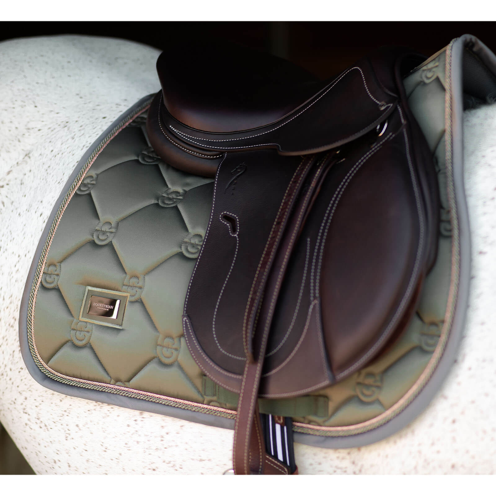 Die Springschabracke Striking Valley besticht durch ihren eleganten olivgrünen Farbton, der durch eine graue Kantenbordüre und roségoldene Paspelierung veredelt wird. Das Metallabzeichen in Roségold verleiht der Schabracke einen Hauch von Luxus, während das Design gleichzeitig für eine optimale Passform sorgt, die deinem Pferd Bewegungsfreiheit bietet.