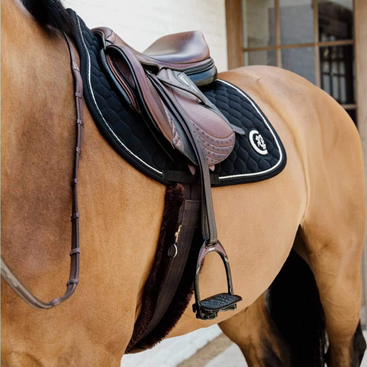 Die Springschabracke beeindruckt mit ihrer eleganten Zwiebel-Steppung, die nicht nur ästhetisch ansprechend ist, sondern auch das Dämpfungsmaterial sicher in Position hält. Das sportliche 3D-Logo von Kentucky Horsewear verleiht der Schabracke einen modernen Touch und hebt sie von der Masse ab. Mit ihrer anatomischen Form sorgt sie für eine optimale Passform und verhindert Druck- sowie Reibungspunkte.