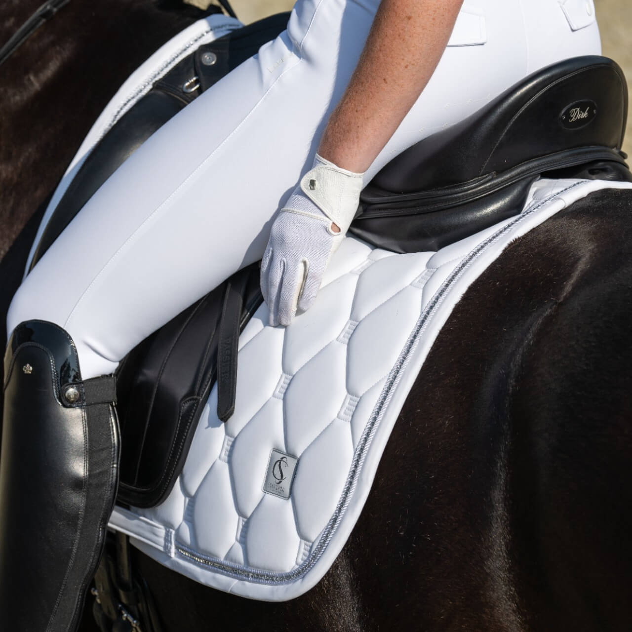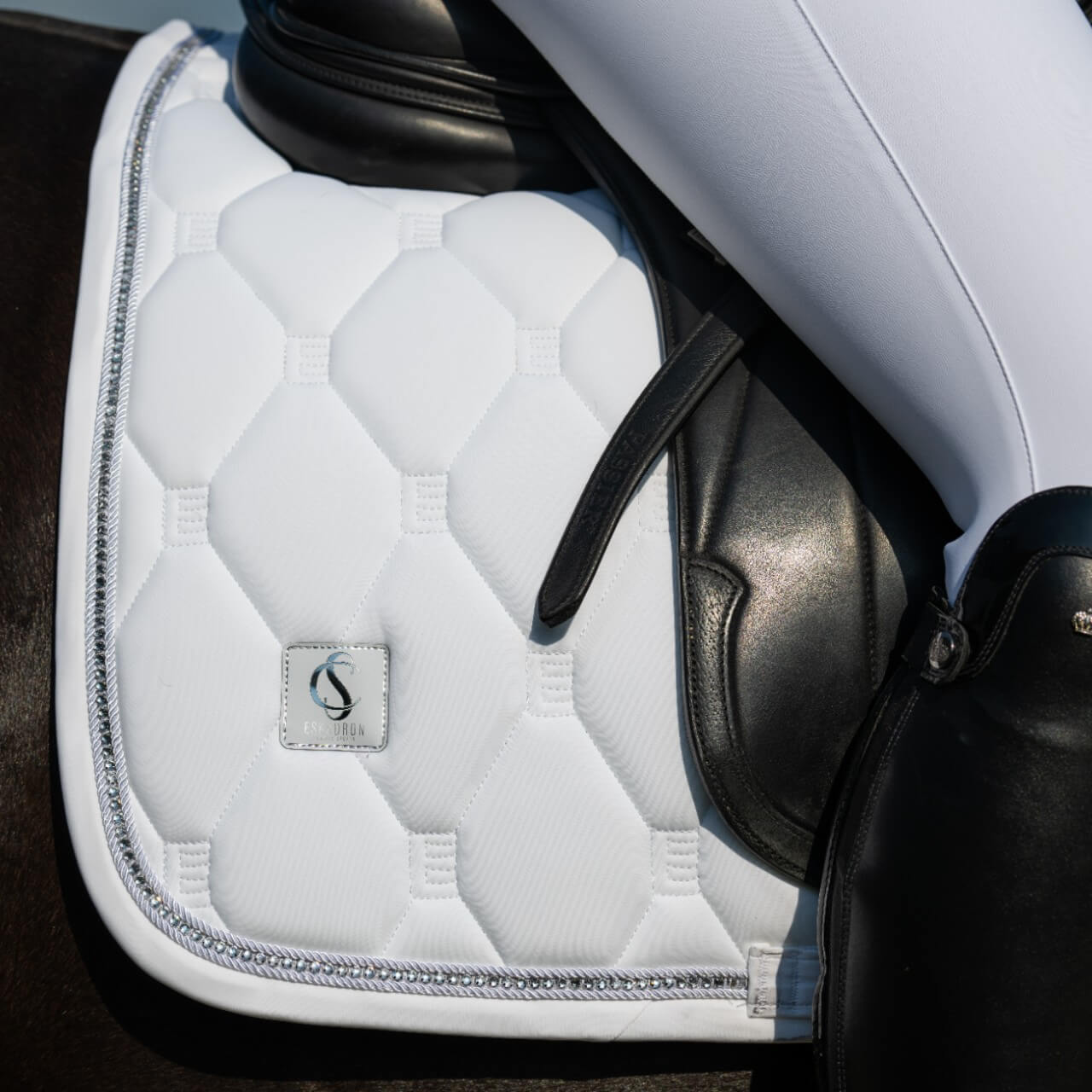 Das visuelle Highlight dieser Schabracke ist die elegante E-Steppung, die zusammen mit den luxuriösen Kristallstein-Akzenten für eine exklusive Optik sorgt. Diese Designelemente verleihen deinem Pferd eine edle Ausstrahlung, während die Kordel-Details und die Softshell-Einfassung praktische Vorteile wie Langlebigkeit und Pflegeleichtigkeit bieten.