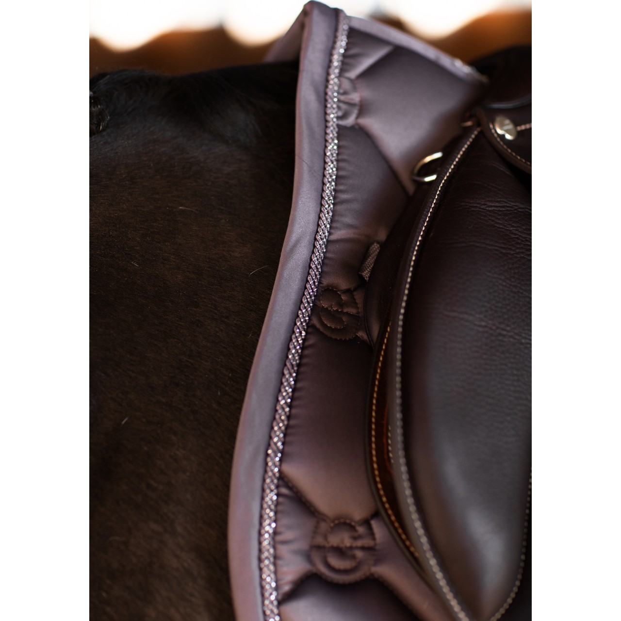 Die elegante Farbgebung in dunklem Violett verleiht deinem Auftritt im Parcours eine stilvolle Note. Silberne Details wie die Zierkordel und das Logo-Badge setzen gezielte Highlights. Das charakteristische Monogramm-Steppmuster unterstreicht den exklusiven Look der Schabracke. Die anatomische Form sorgt für einen optimalen Sitz und verhindert ein Verrutschen während des Reitens. Hochwertige Verarbeitung garantiert eine lange Lebensdauer – auch bei intensiver Nutzung. Dank der dezenten, aber auffälligen Farbgestaltung passt die Schabracke perfekt zu verschiedenen Outfits und Sattelfarben.