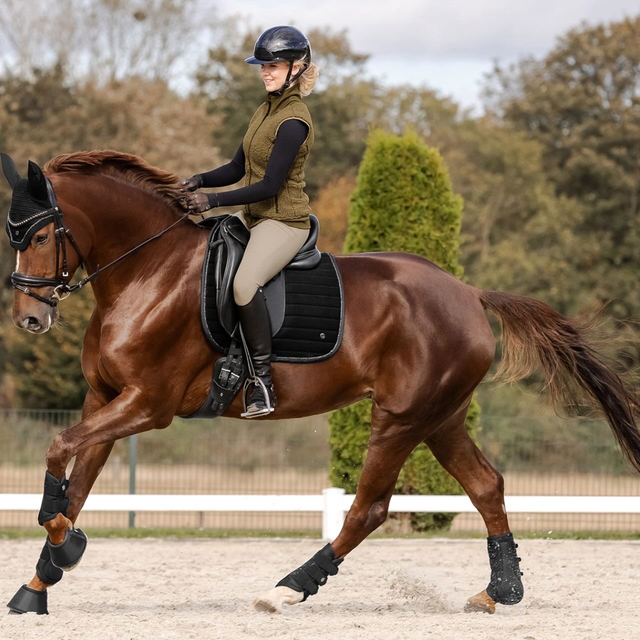 Dank einer Füllung aus 10 mm Schaum und 300 g/m² Wattierung ist eine gleichmäßige Druckverteilung gewährleistet. Das Innenfutter aus Polyester unterstützt eine hohe Atmungsaktivität und erleichtert die Nutzung im Training wie auch im Wettkampf. Wahlweise können einfache oder unterteilte Strupfenschlaufen genutzt werden. Die abnehmbaren Klettschlaufen ermöglichen eine flexible Anpassung an unterschiedliche Sättel. Damit bietet die Schabracke hohen Komfort für Pferd und Reiter. Auch bei intensiver Beanspruchung bleibt sie formstabil und funktional.