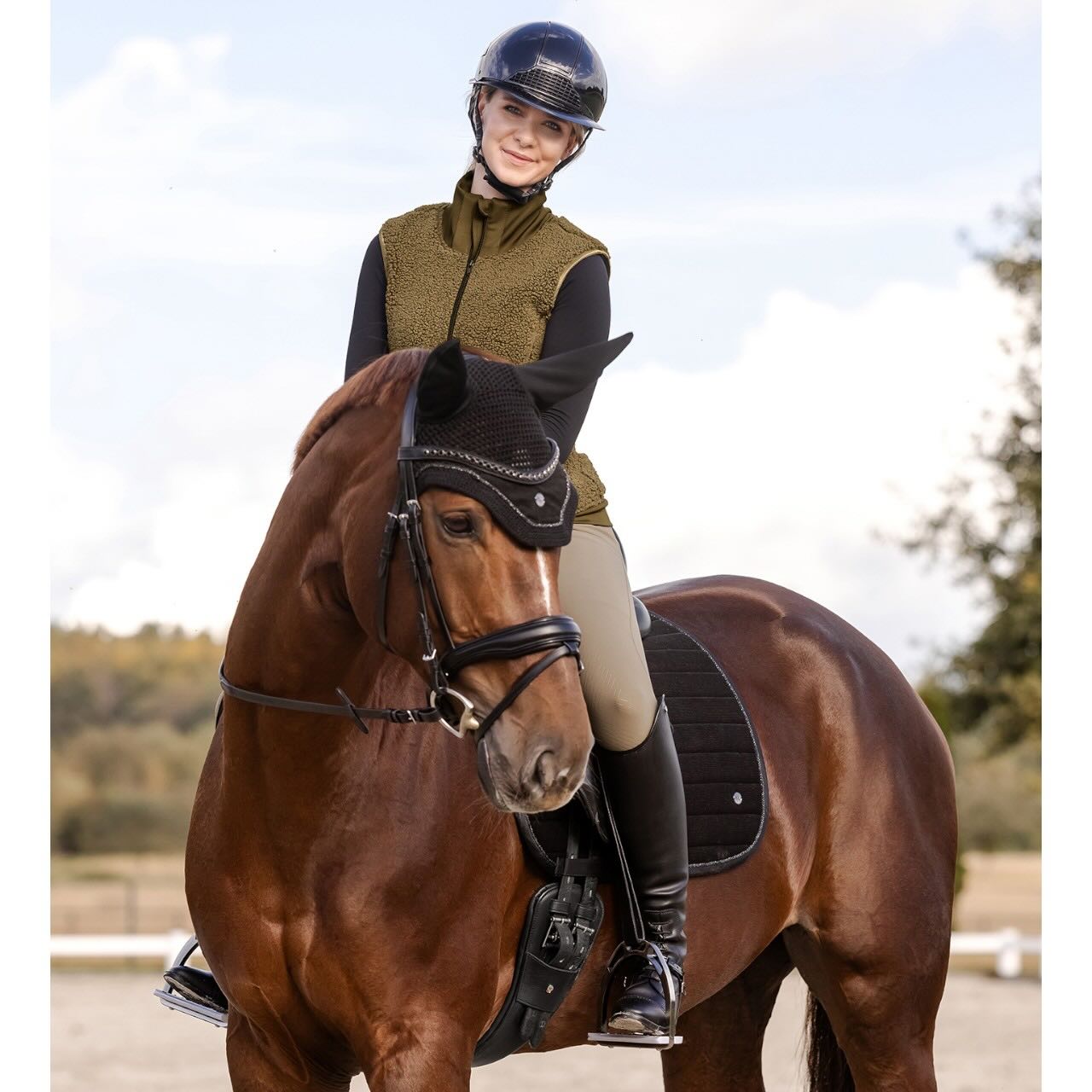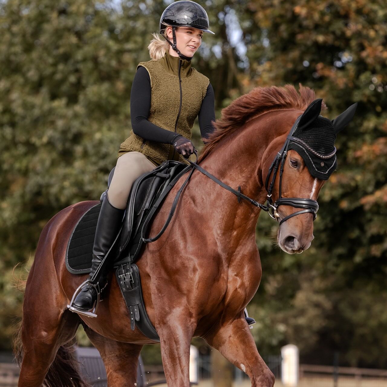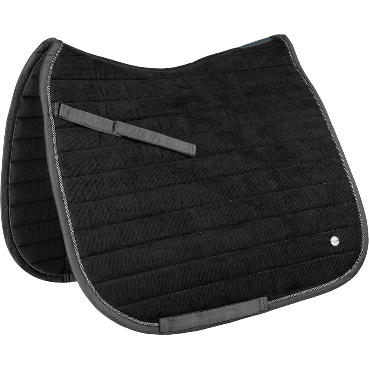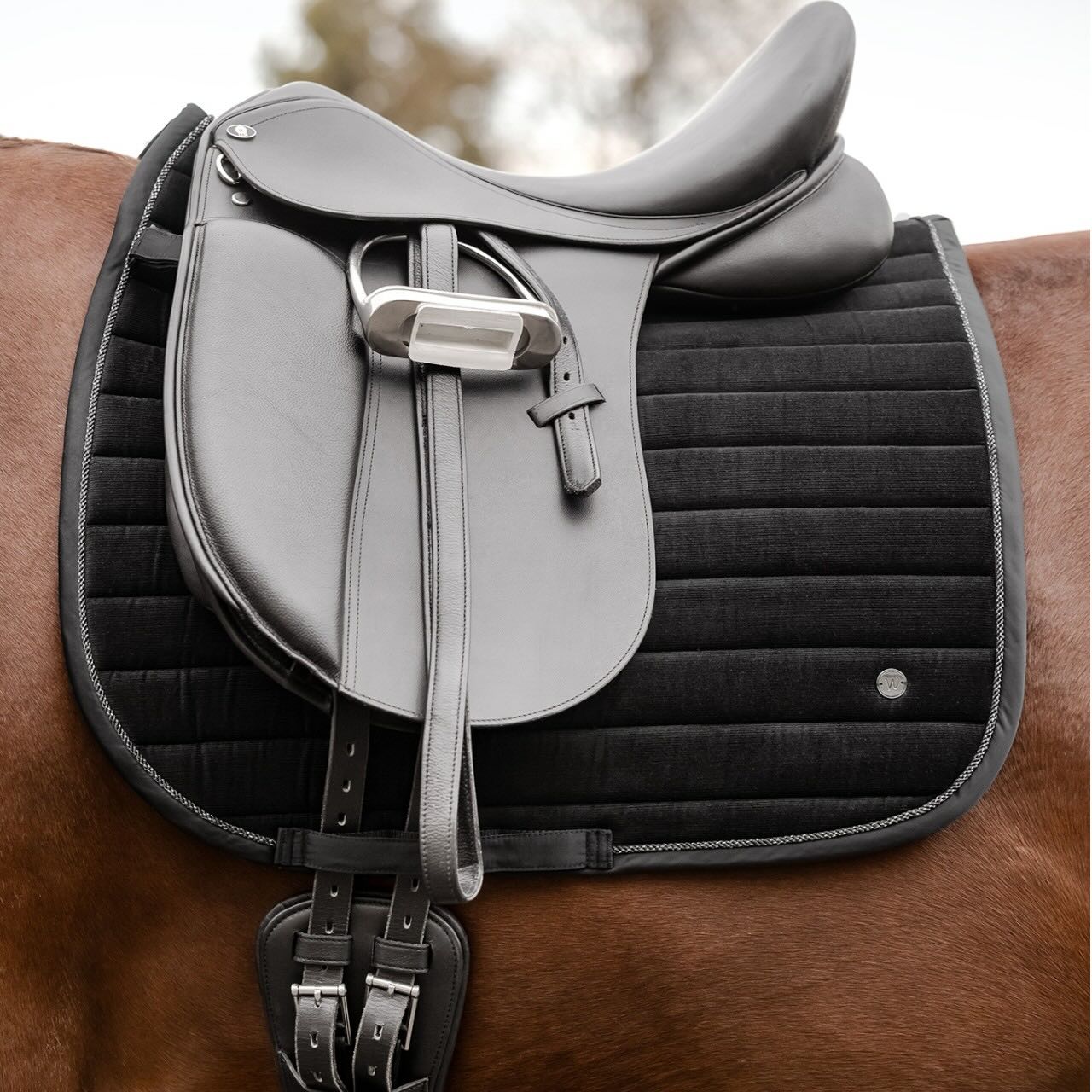 Die Springschabracke St. Gallen überzeugt mit einer eleganten Cord-Oberfläche, die dem Gesamtbild eine edle Note verleiht. Abgerundet wird das Design durch eine glitzernde Kordel, die den Rand akzentuiert. Das anthrazitfarbene Metallplättchen betont die hochwertige Verarbeitung. Damit eignet sich die Schabracke nicht nur für das tägliche Training, sondern auch für den Auftritt auf Turnieren. Mit diesem Modell setzt du auf eine Schabracke, die Funktionalität und modischen Anspruch kombiniert. So erhält dein Pferd eine Schabracke, die optisch und praktisch überzeugt.