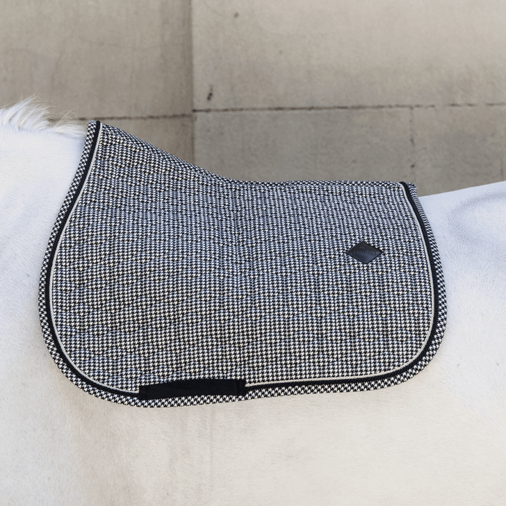 Springschabracke Pied-De-Poule Sattelunterlage von Kentucky Horsewear vereint stilvolle Eleganz mit optimalem Komfort für dein Pferd. Mit ihrem ikonischen Pied-de-Poule-Muster und einem anatomischen Schnitt bietet sie nicht nur einen visuellen Hingucker, sondern auch höchsten Komfort und Schutz vor Verspannungen während des Springens und der Vielseitigkeit.