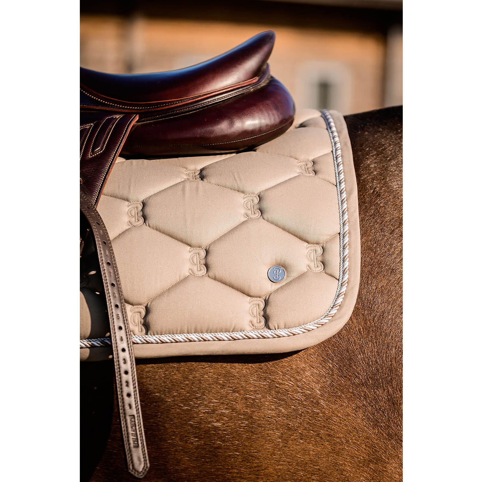 Das leicht schimmernde Muster der Springschabracke Classic FS 2022 verleiht deinem Pferd einen eleganten Look. Die ikonische PS-Aufschrift entlang der Wirbelsäule ist nicht nur ein stilvolles Detail, sondern sorgt auch für einen sicheren Halt. Mit Farben wie Moon Rock und Lotus Pink kannst du deinem Stil individuell Ausdruck verleihen.