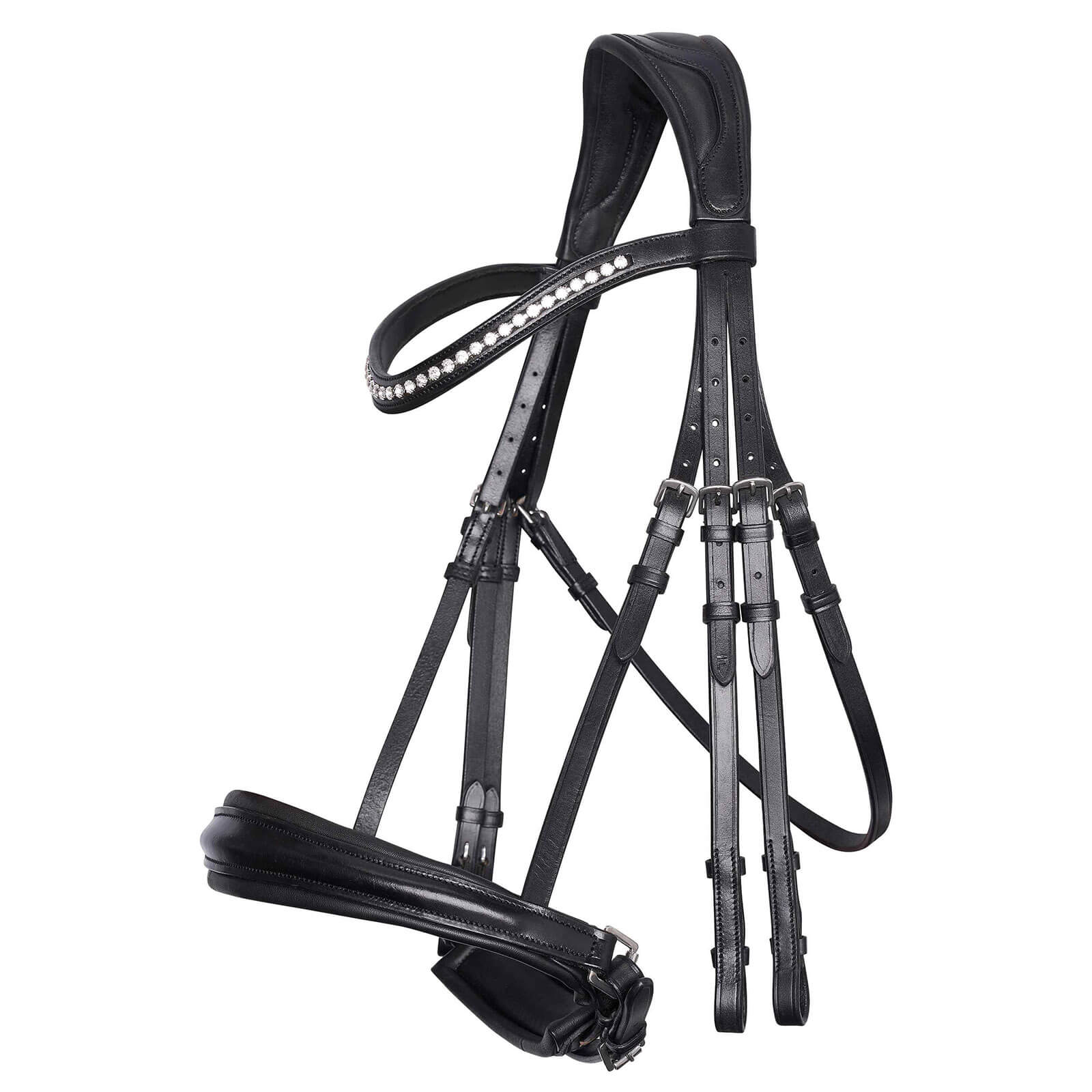 Der Kandarenzaum IRHFria besticht durch sein elegantes Erscheinungsbild. Mit in Leder eingefassten Strasssteinen verleiht das Stirnband jedem Pferd einen luxuriösen Look. Die anatomisch geformten Elemente sorgen nicht nur für eine ansprechende Optik, sondern bieten auch praktischen Nutzen, indem sie sich perfekt an die Konturen des Pferdekopfes anpassen.