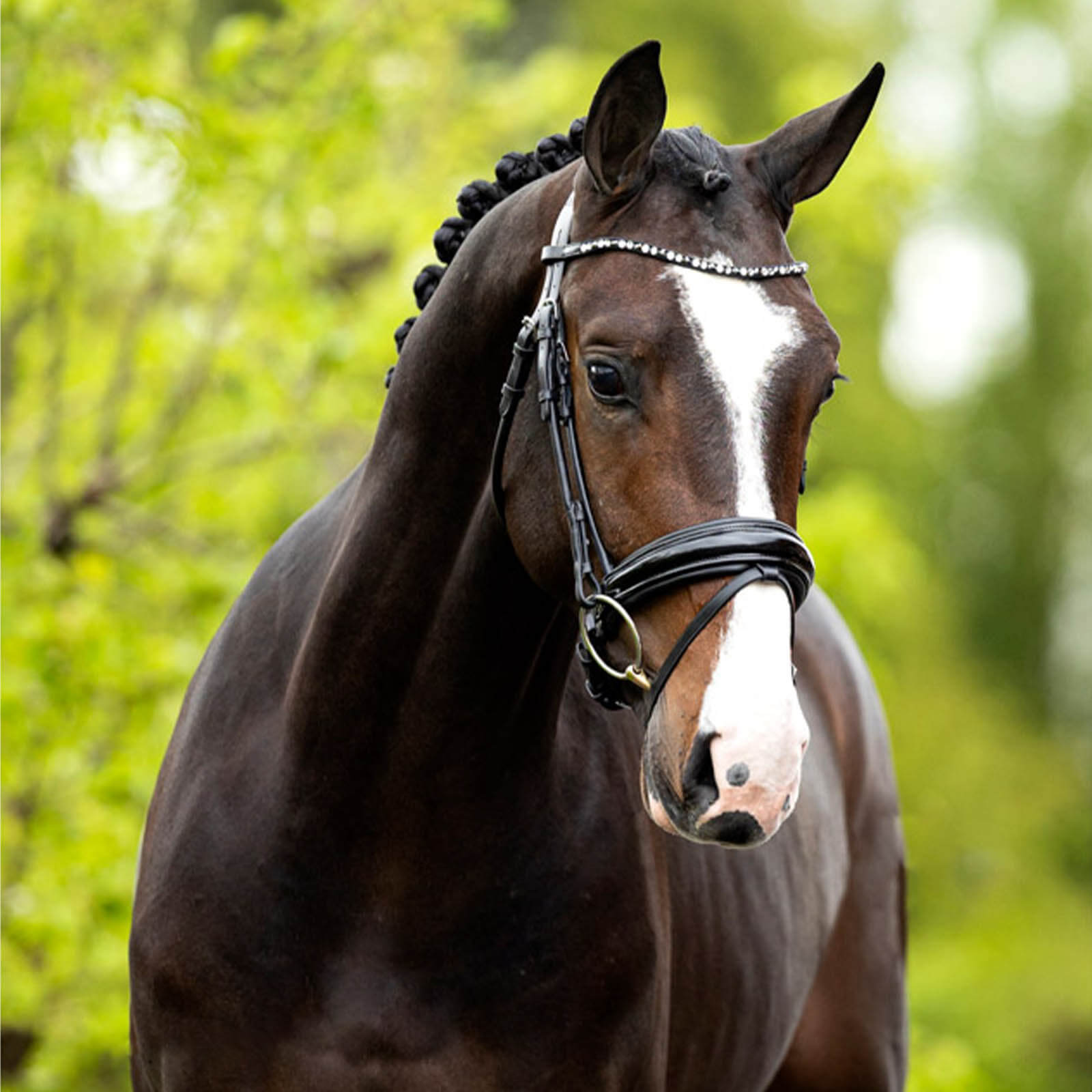 Der Trensenzaum Andover besticht durch sein stilvolles Äußeres. Die Kombination aus einem geschwungenen Stirnband mit funkelnden Kristallen und den runden, silberfarbenen Schnallen macht ihn zu einem wahren Blickfang. Ein Lack-Nasenriemen verleiht zusätzliche Eleganz, während das breite Kinnpolster für einen harmonischen Gesamteindruck sorgt.