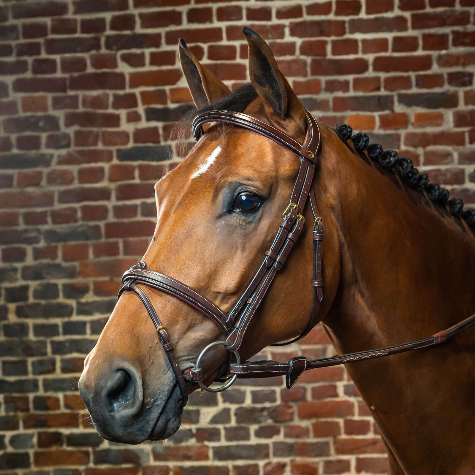 Die leicht kantige Form des Stirn- und Nasenriemens, akzentuiert durch feine Ziernähte, verleiht der Trense einen unverwechselbaren, edlen Look. Die sorgfältig ausgewählten Messingbeschläge unterstreichen die luxuriöse Optik und bieten gleichzeitig Langlebigkeit. Dieses Design sorgt nicht nur für einen beeindruckenden Auftritt, sondern unterstützt auch die perfekte Passform.