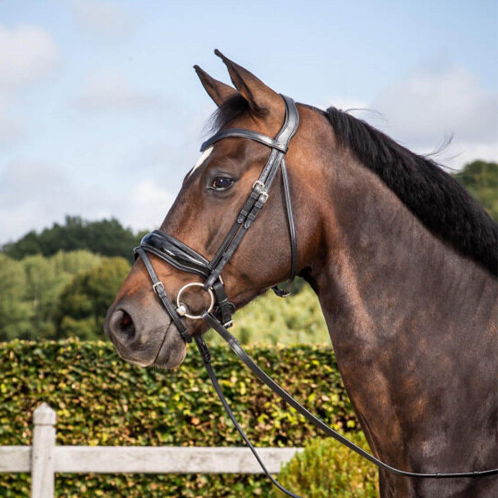 Trense mit breitem schwedisch-kombiniertem Lackreithalfter New English Collection Trensenzaum von Dy'on – Perfektion trifft Eleganz
