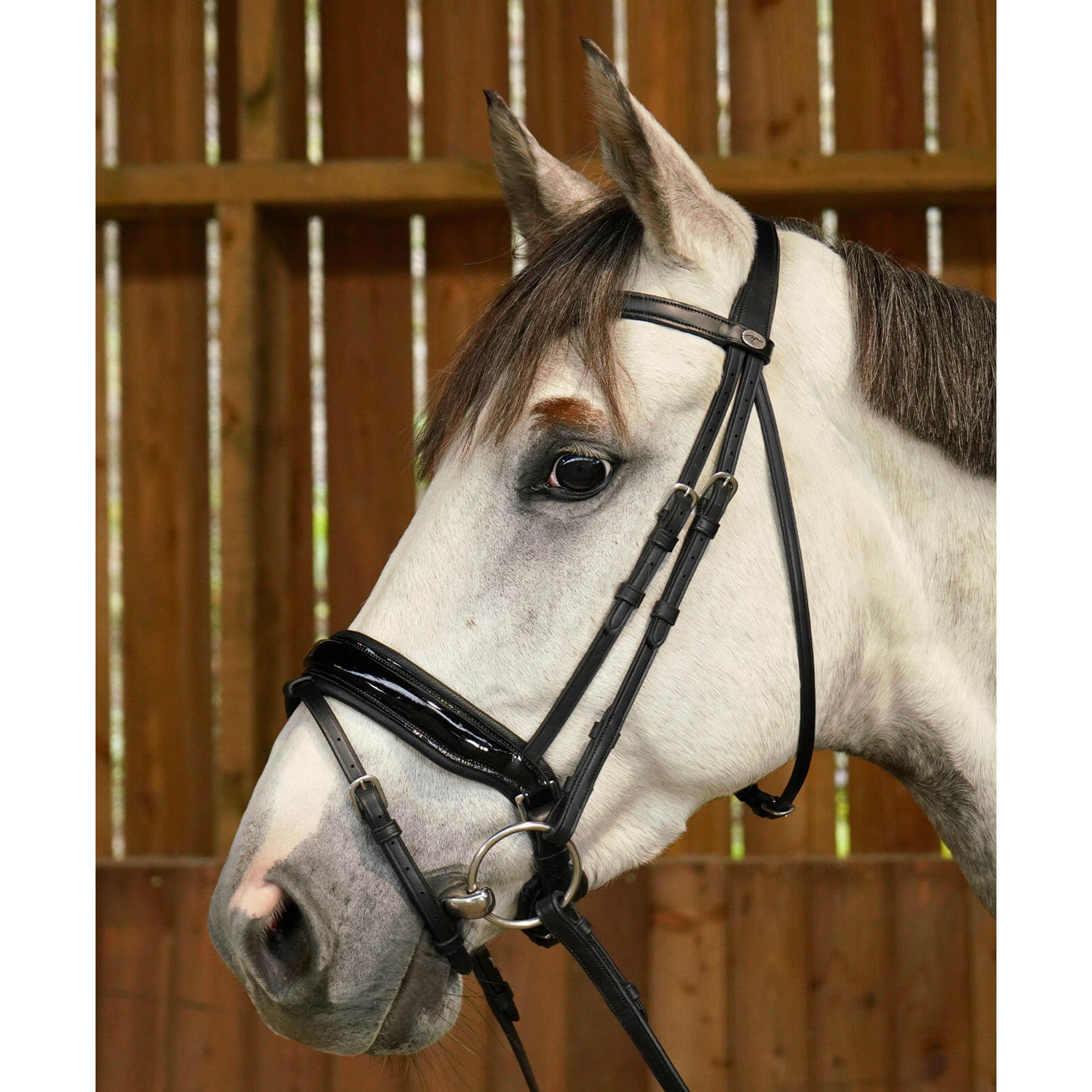 Der schwarze Lacknasenriemen der Trense verleiht ihr einen unverwechselbaren, luxuriösen Look, der auf jedem Turnier ein Hingucker ist. Der geschmeidige Stirnriemen in V-Form sowie der anatomisch geformte Nasenriemen sorgen nicht nur für eine elegante Optik, sondern auch für eine optimale Passform und Druckverteilung. So kombiniert die Trense ästhetische Ansprüche mit praktischen Vorteilen.