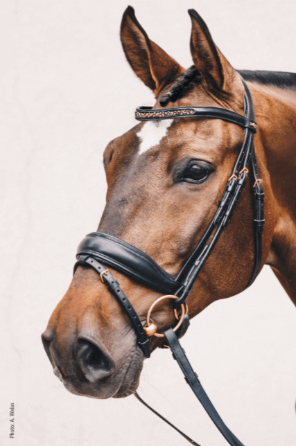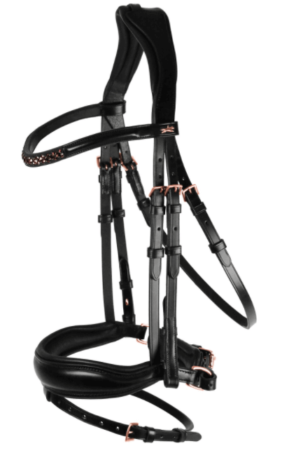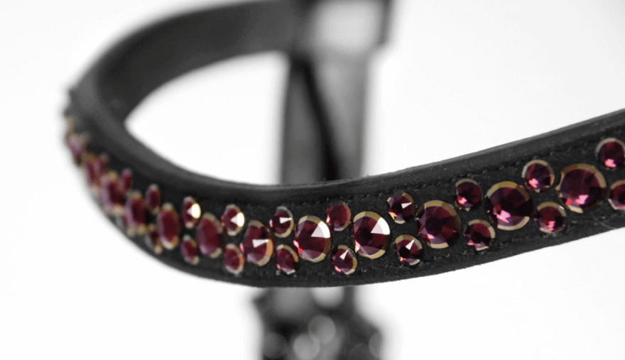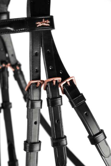 Die Trense Stanford S besticht durch ihr elegantes Design in den Farben black, burgundy und rose. Das farbige Stirnband, verziert mit Swarovski® Kristallen, und die rosé-goldenen Schnallen setzen edle Akzente. Diese optischen Highlights sorgen nicht nur für ein stilvolles Erscheinungsbild, sondern auch für einen unverwechselbaren Look im Dressurviereck.