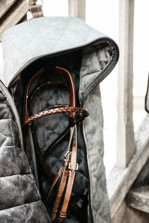 | Besonderheiten | Bietet Schutz für die Trense, Diamanten-Steppung, Haken zum Anbringen der Tasche und für die Trense |