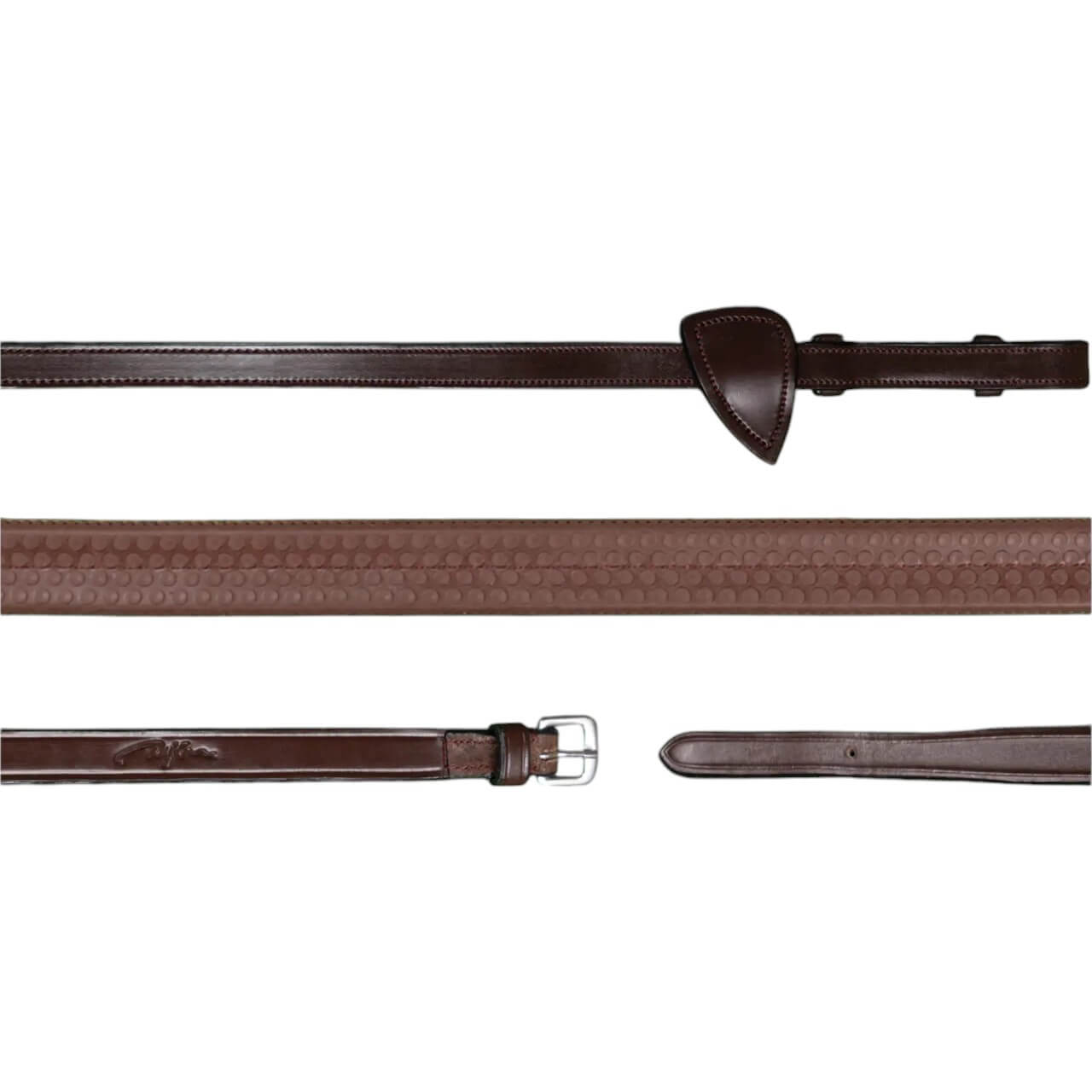 Die Gummizügel 16mm New English Collection Zügel bestechen durch ihr klassisches Design in edlem Braun. Das hochwertige Dy'on-Leder verleiht den Zügeln nicht nur einen luxuriösen Look, sondern sorgt auch für eine lange Lebensdauer. Die schlanken 16mm Breite bieten dir eine angenehme Handhabung und optimale Kontrolle, während die Dy'on-Stopper für eine sichere Zügelführung sorgen.