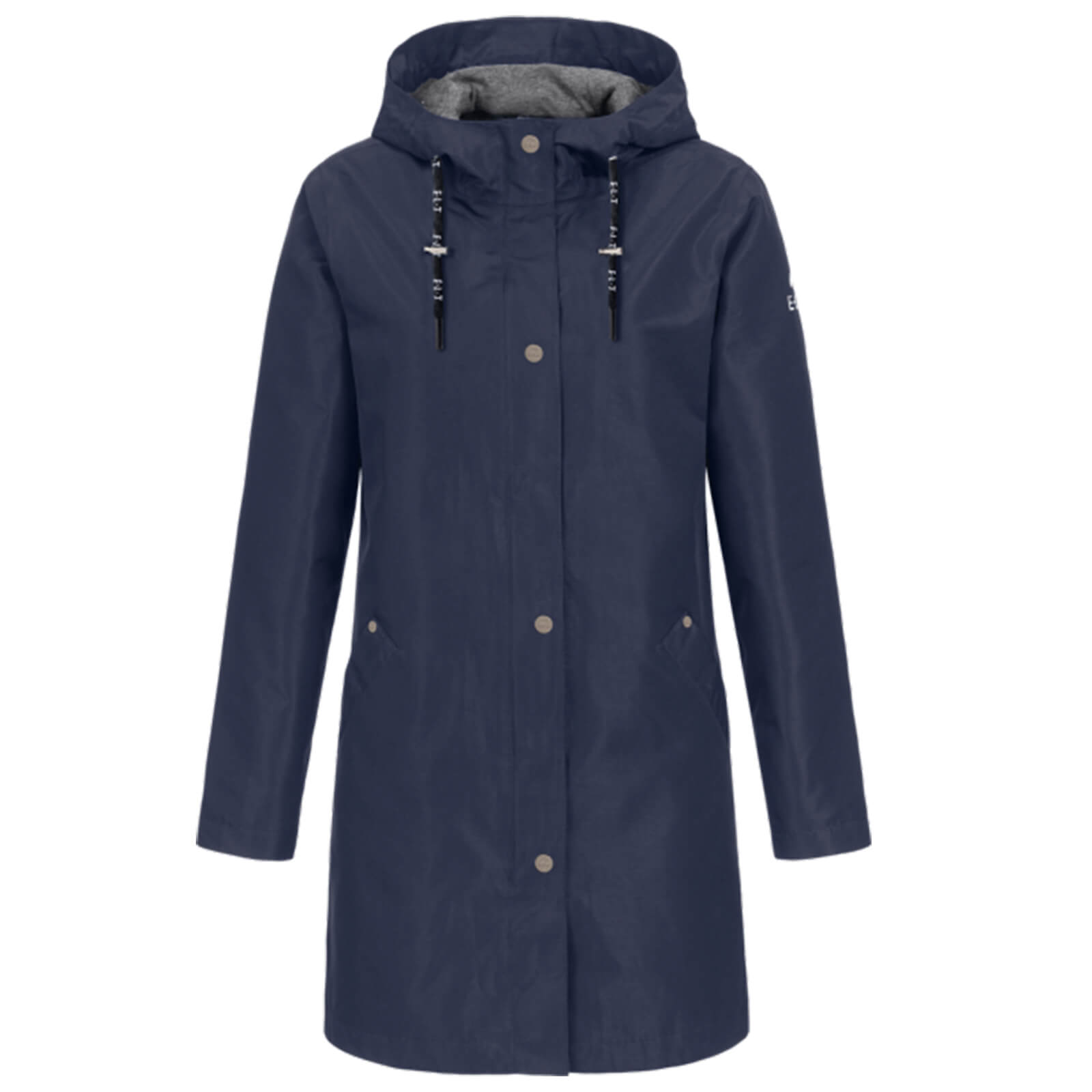 Der Regenmantel Damen Emilia besticht durch seine klare Linienführung und die klassische Nachtblau-Farbe, die jedem Outfit einen eleganten Touch verleiht. Die fixierbare Kapuze und die verstellbaren Logo-Kordeln bieten nicht nur Schutz, sondern auch ein modisches Statement. Mit seinen reflektierenden Logo-Details auf dem Ärmel bist du auch bei schlechtem Wetter stets gut sichtbar.