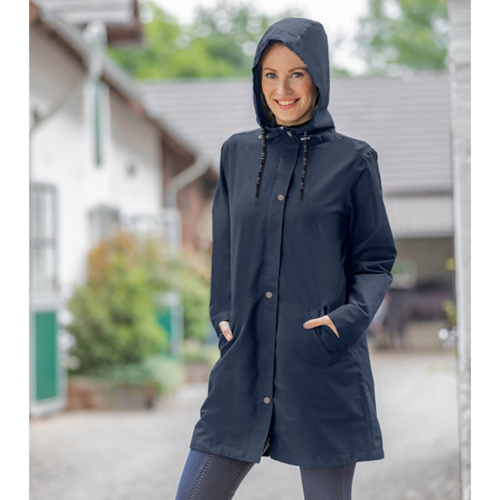 Egal ob beim gemütlichen Ausritt oder bei einem Spaziergang im Regen, der Regenmantel Damen Emilia ist stets an deiner Seite. Dank seines pflegeleichten Polyester-Materials ist er schnell wieder einsatzbereit. Sei bereit für jedes Abenteuer – mit diesem Regenmantel meisterst du jedes Wetter mit Leichtigkeit!