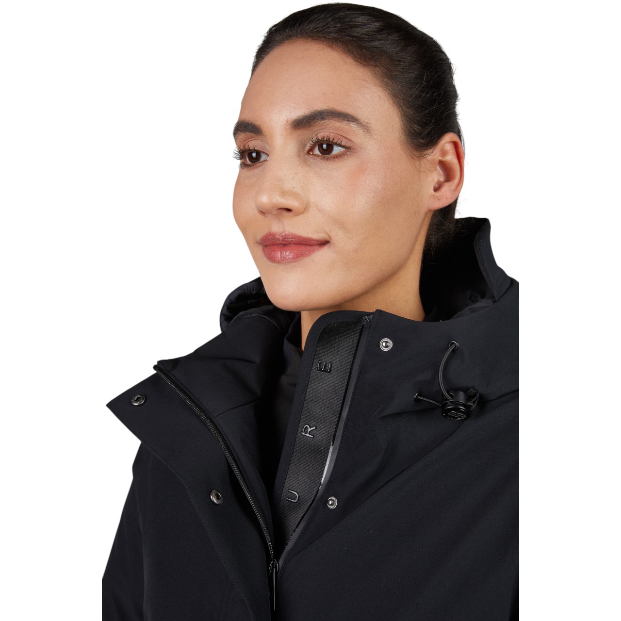 Für kalte Tage ist der Mantel mit einer Fibreballfüllung ausgestattet, die exzellente Wärmespeicherung und einen angenehm soften Griff bietet. Besonders innovativ ist das wärmespeichernde Graphene Heating Storage im Rücken, das Körperwärme effizient speichert. Lange, seitliche Reißverschlussschlitze mit verstecktem Futter optimieren die Passform im Sattel. Die komfortable Reißverschlussblende mit Magnet-Klick-System erleichtert das Schließen auch mit Handschuhen. Die Schirmkapuze aus Oberstoff ist mit Nylon-Steppfutter ausgestattet und per Kordelstopper größenverstellbar.