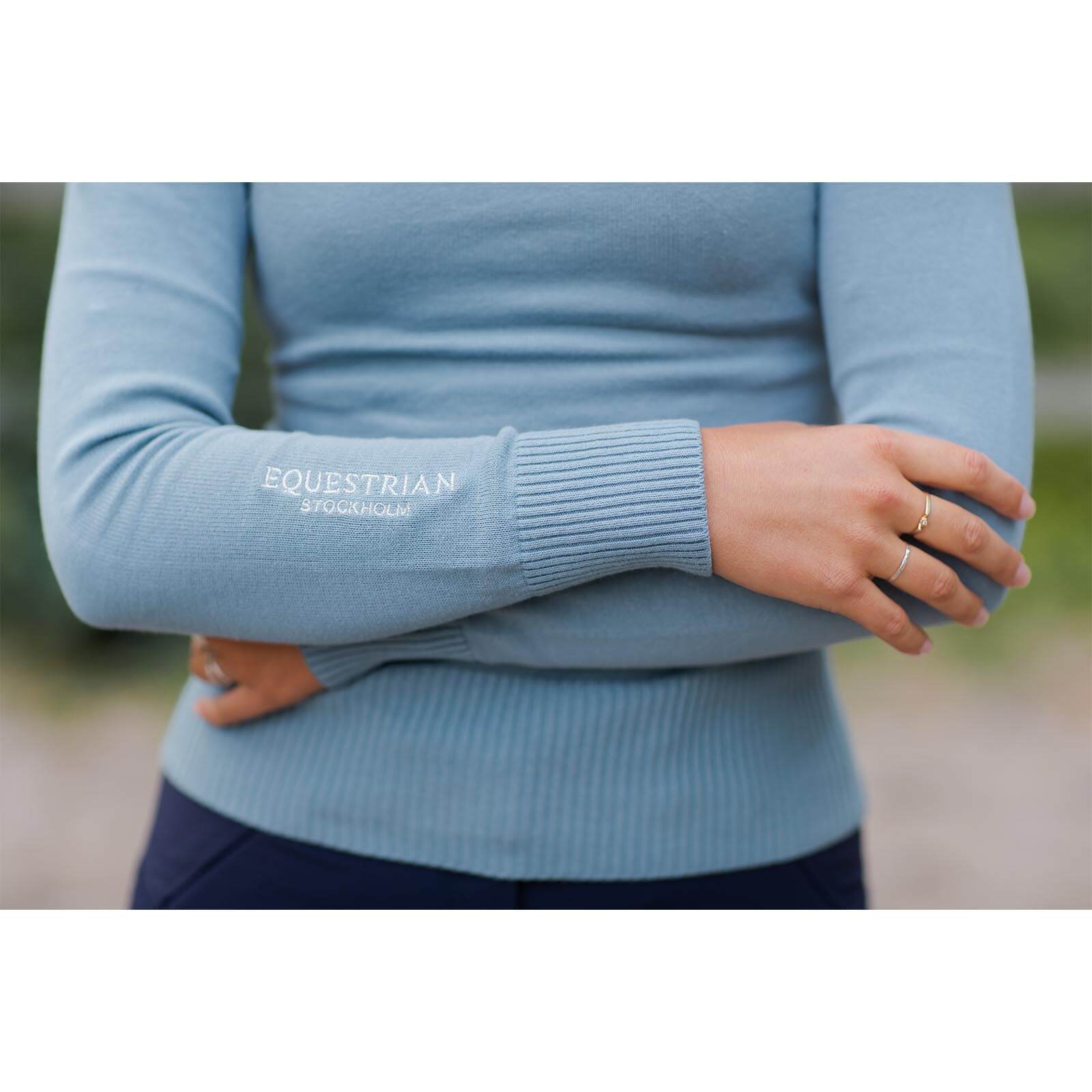 Der Rollkragenpullover besticht durch sein wunderschönes Hellblau, das mit dezenten silbernen Details veredelt wird. Zwei silberne Equestrian Stockholm Logos zieren den Pullover und verleihen ihm einen edlen Touch. Die lockere Passform sorgt für zusätzlichen Tragekomfort und kann je nach Belieben enger gewählt werden, um deine Silhouette zu betonen.
