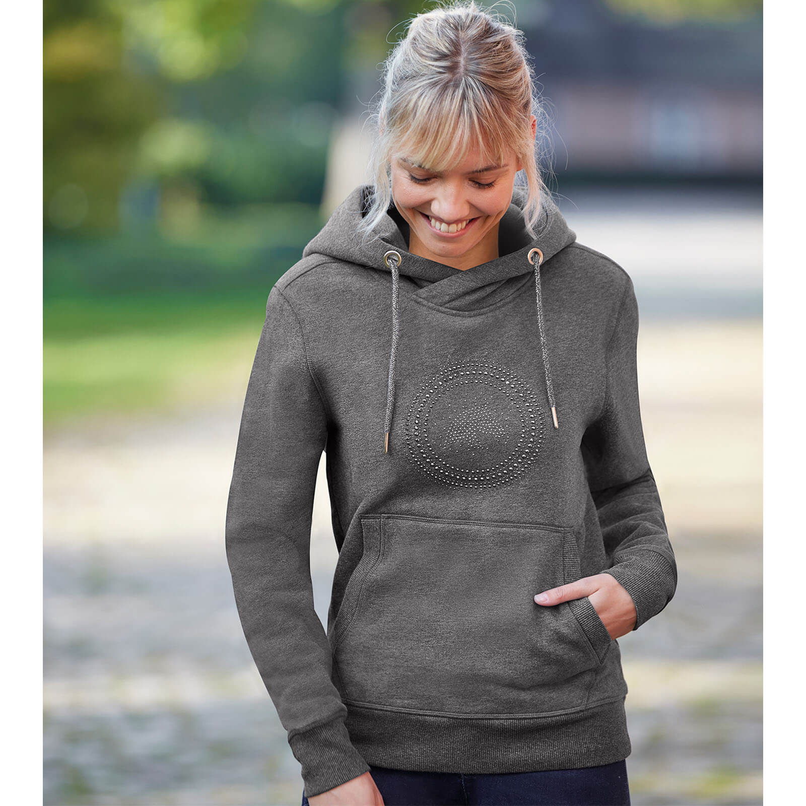 Der Malaga Hoody besticht durch seine ansprechende taillierte Passform, die deiner Silhouette schmeichelt. Die Farben Zinn Melange und Perlmutt bringen Eleganz in deinen Alltagslook. Abgerundet wird das Design durch ein funkelndes Pferdekopf-Motiv aus Strasssteinchen, das dem Pullover eine edle Note verleiht und gleichzeitig deine Liebe zum Reitsport unterstreicht.