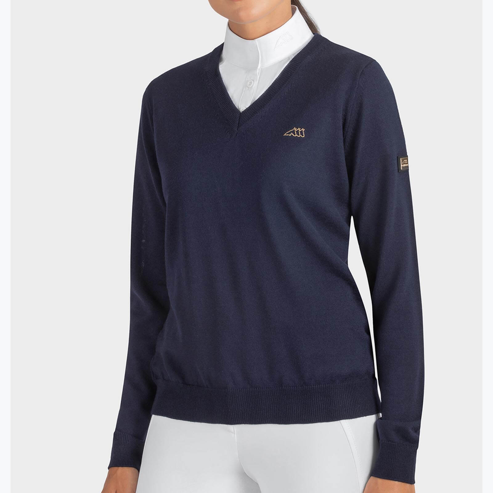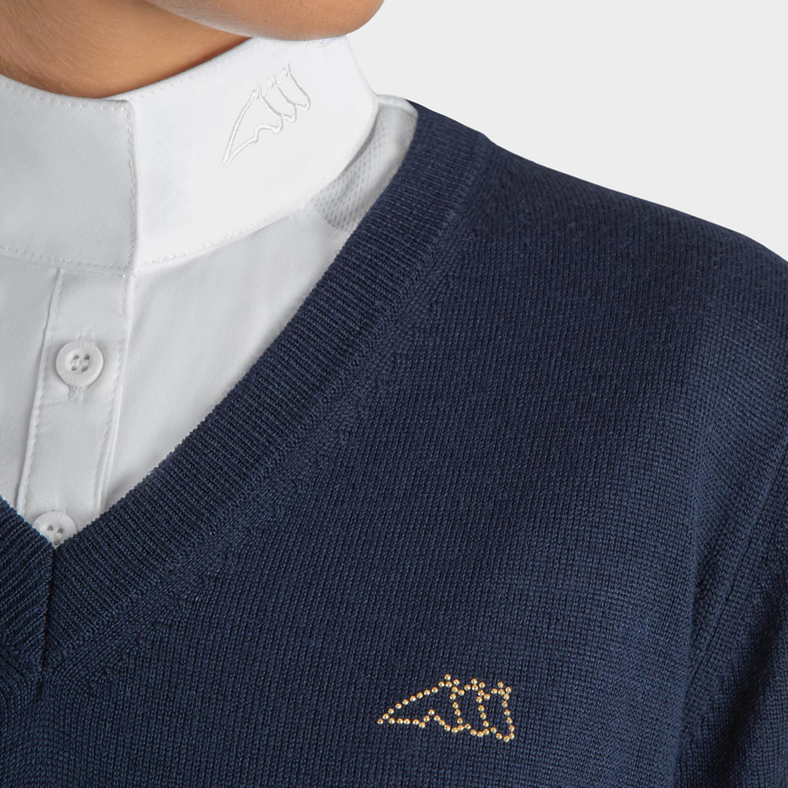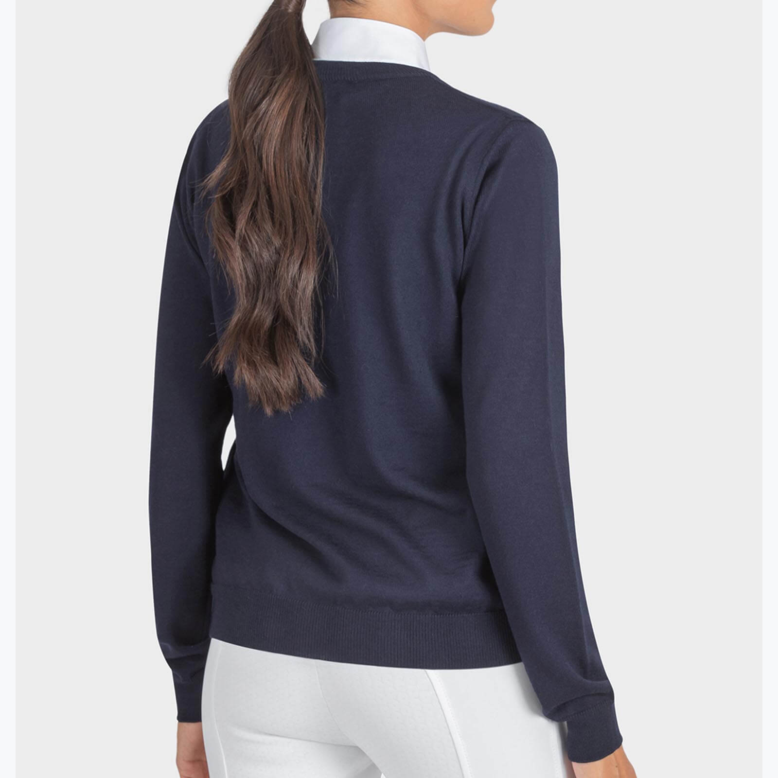 Der Pullover besticht durch seine zeitlose blaue Farbgebung und den eleganten V-Ausschnitt. Das edle Equiline Logo aus hellgoldenen Mikronieten verleiht dem Pullover eine luxuriöse Note. Dieses Design ist nicht nur ästhetisch ansprechend, sondern bietet auch eine optimale Passform, die Bewegungsfreiheit garantiert.