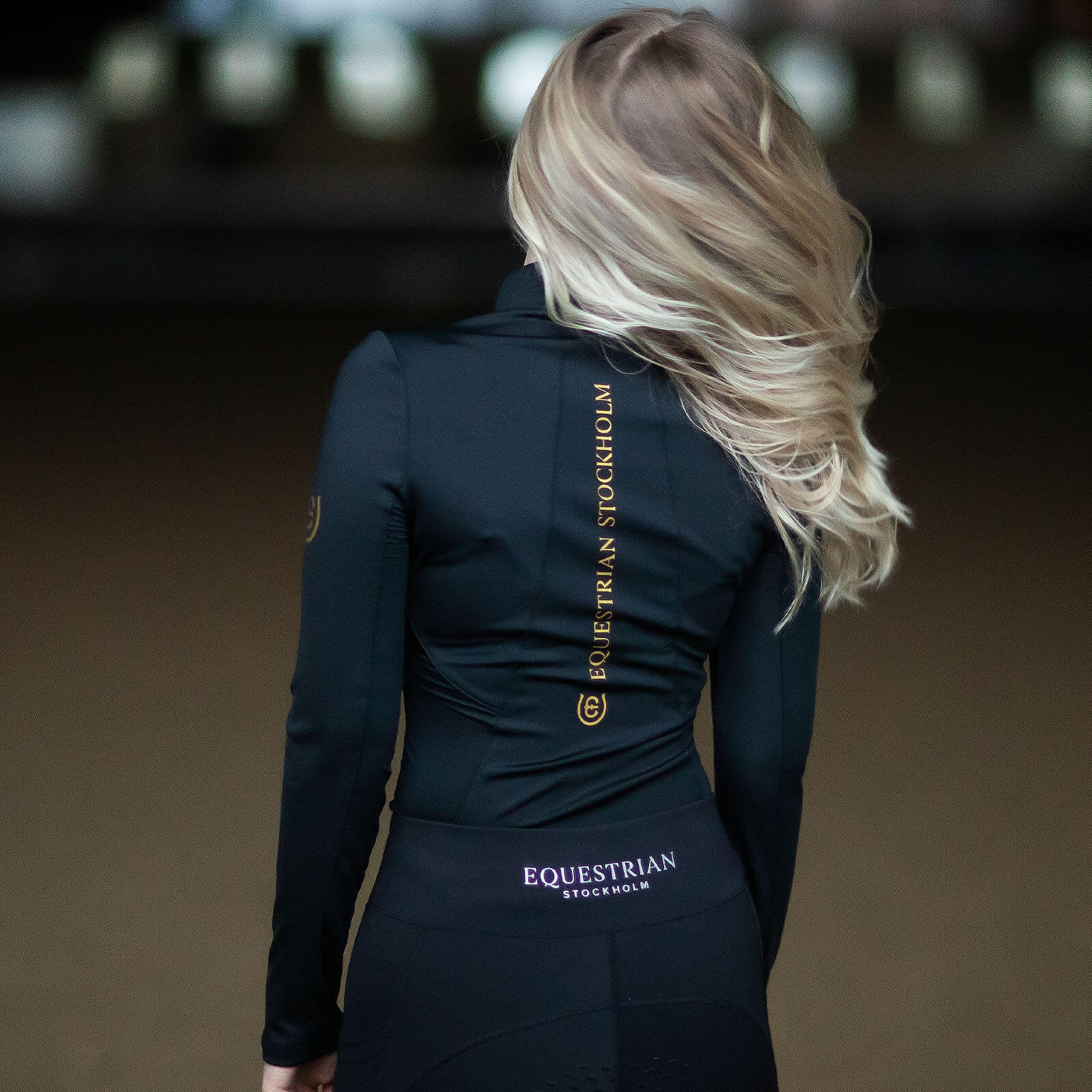 Das Vision Top Black Gold besticht durch sein luxuriöses, schwarzes Design mit edlen goldenen Details. Die schmale Passform und die Mesh-Einsätze an den Seiten sorgen nicht nur für eine elegante Silhouette, sondern auch für optimale Belüftung. Mit dem vertikalen Equestrian Stockholm-Logo auf dem Rücken und dem dezenten Logo am Arm setzt du modische Akzente.
