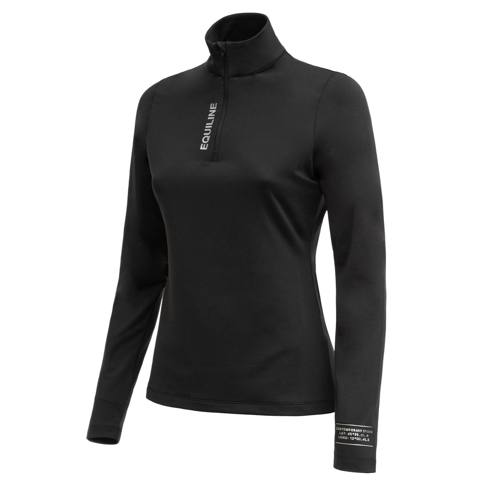 Das Funktionsshirt in edlem Schwarz besticht durch ein schlichtes, aber dennoch elegantes Design, das durch das silberne Equiline-Logo auf der Vorderseite und den Ärmeln veredelt wird. Der halbhohe Reißverschluss ist nicht nur ein stilvoller Hingucker, sondern ermöglicht dir auch eine individuelle Anpassung der Belüftung bei jeder Wetterlage.