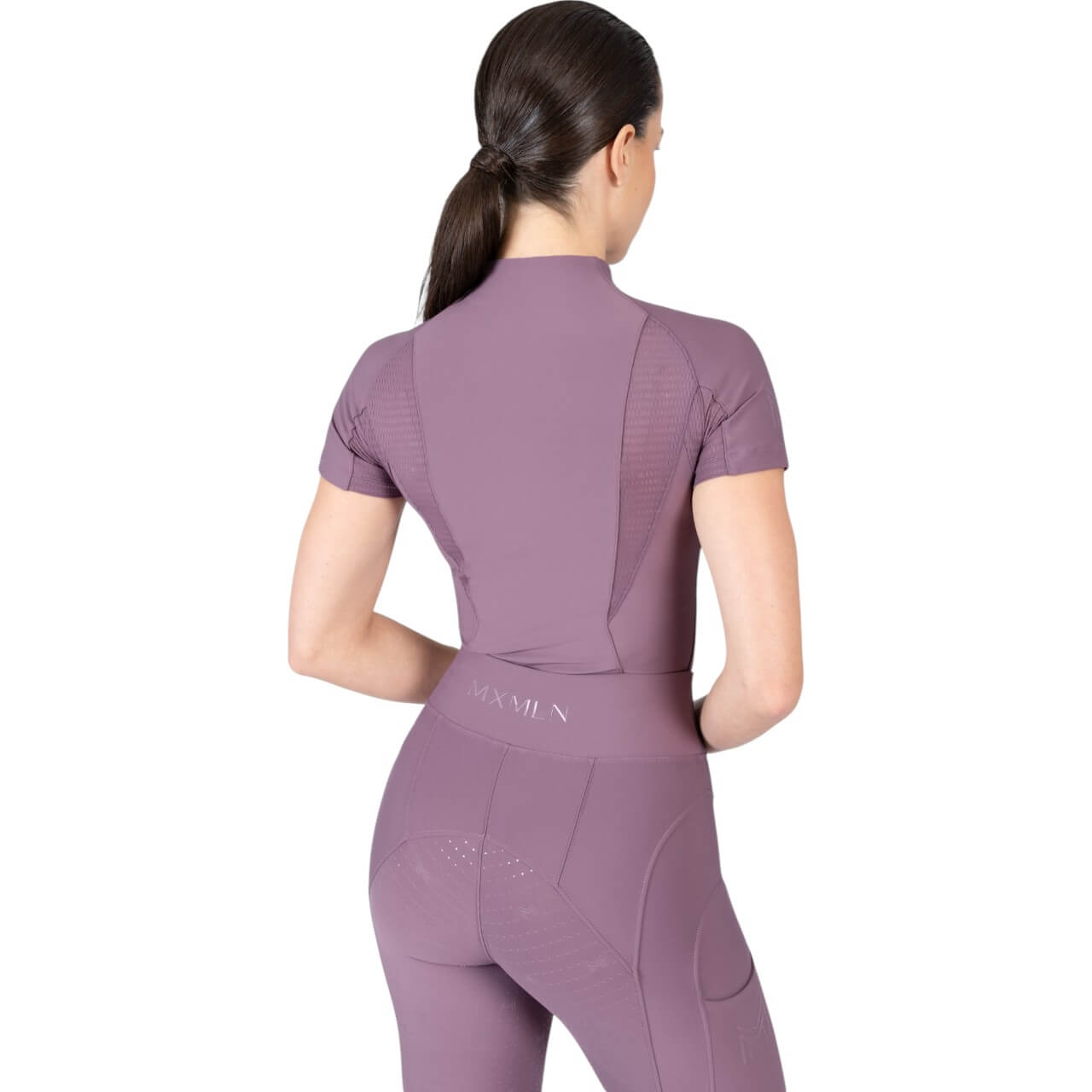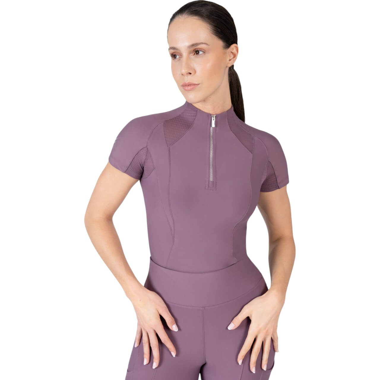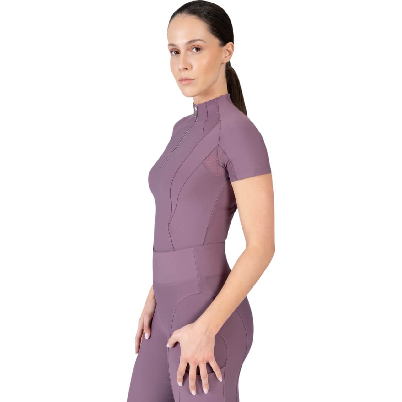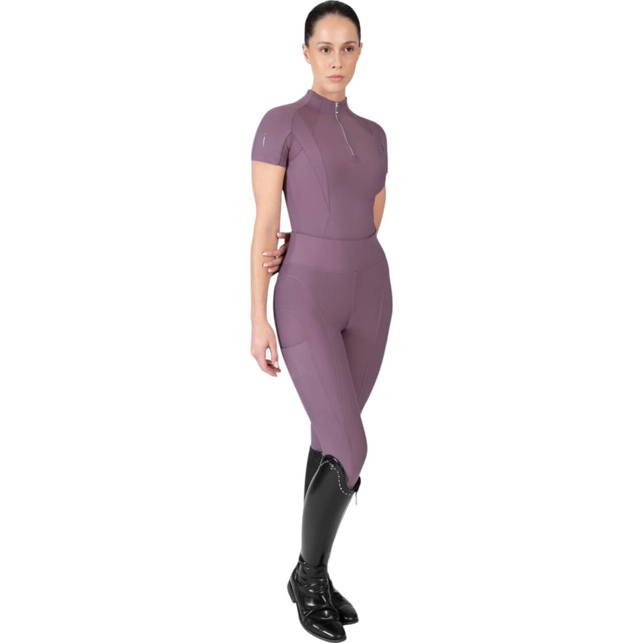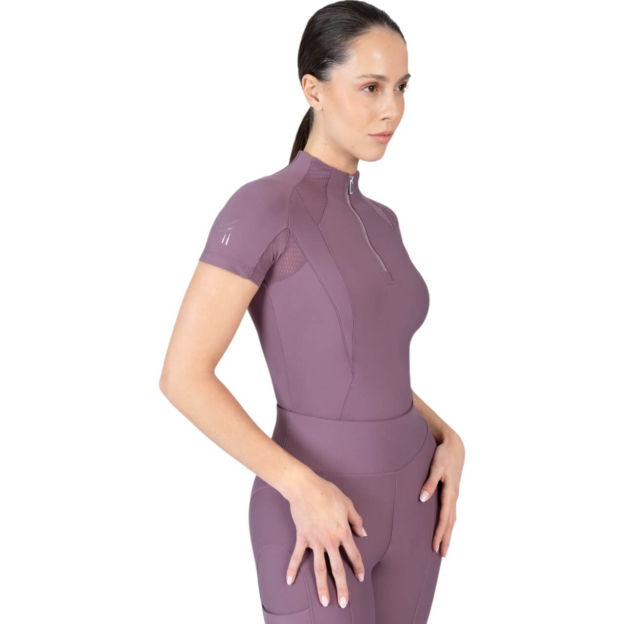 Das Funktionsshirt überzeugt durch sein klares und modernes Design. Erhältlich in verschiedenen stilvollen Farben wie Navy, Black, Burgundy und Mauve, passt es zu jeder Reitsport-Garderobe. Die V-förmige Kontur auf Vorder- und Rückseite sorgt nicht nur für eine ästhetische Optik, sondern auch für eine hervorragende Passform, die deinen Bewegungen schmeichelt.