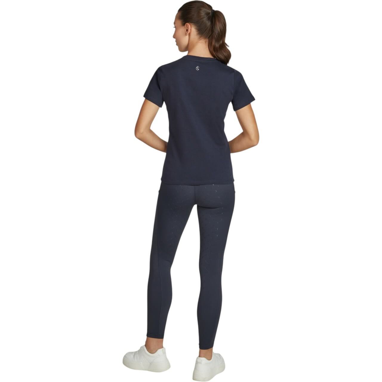 Das T-Shirt besteht aus Baumwolle und fühlt sich angenehm auf der Haut an. Durch den klassischen Rundhalsausschnitt sitzt es unkompliziert und passt zu vielen Outfits. Die schmale Passform unterstützt eine moderne Silhouette, ohne die Bewegungsfreiheit einzuschränken. So eignet es sich für Stallarbeit, Reitunterricht oder den Weg zum Turnier. Auch nach dem Reiten macht es als Basic in der Freizeit eine gute Figur. Damit ist es ein vielseitiges Teil für deinen Reitsport-Kleiderschrank.