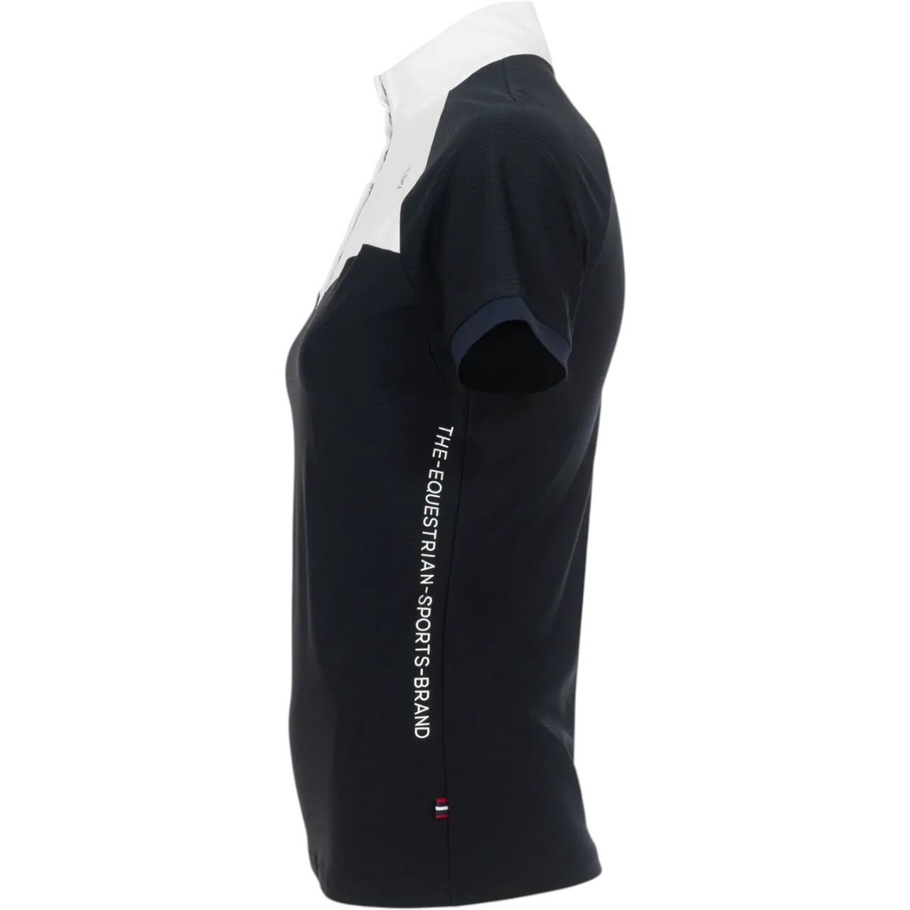 Optisch überzeugt das Shirt mit einer kurzen Knopfleiste mit verdeckten Druckknöpfen. Diese wird durch funkelnde Kristallsteine stilvoll veredelt. Der klassische Stehkragen sowie die vordere Passe sind stets in Weiß gehalten und unterstreichen den Turniercharakter. Ein zarter herzförmiger Ausschnitt an der Front sorgt für eine feminine Note. Der silberfarbene Cavallo-Druck auf Brust und Seite setzt dezente Markenakzente. Dadurch entsteht ein harmonischer Look, der sportlich und elegant zugleich wirkt.