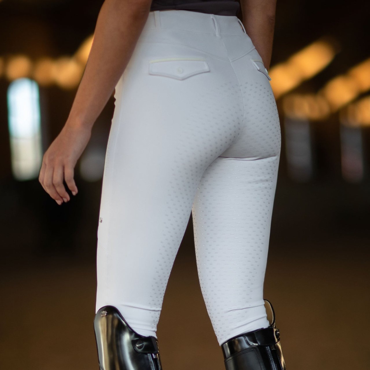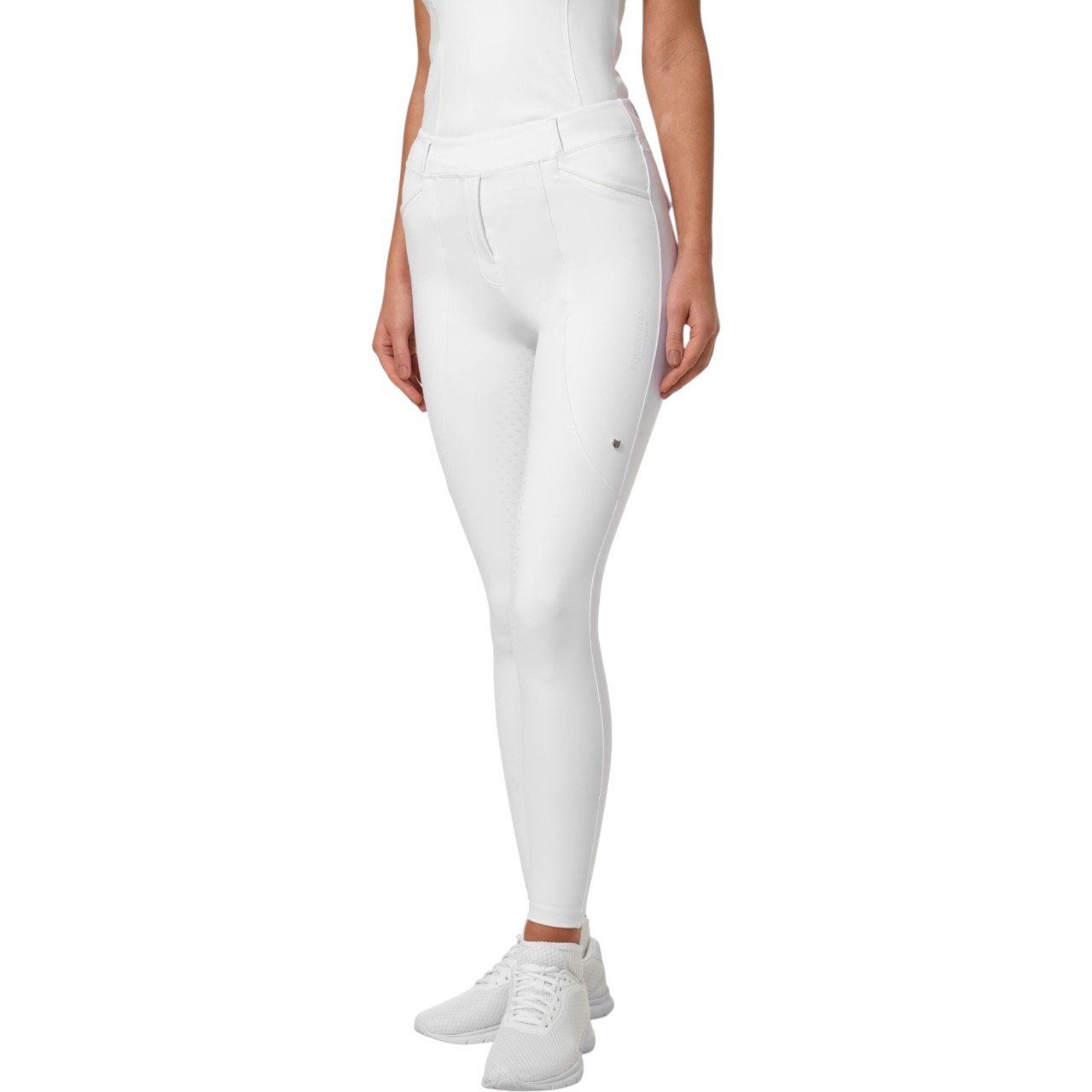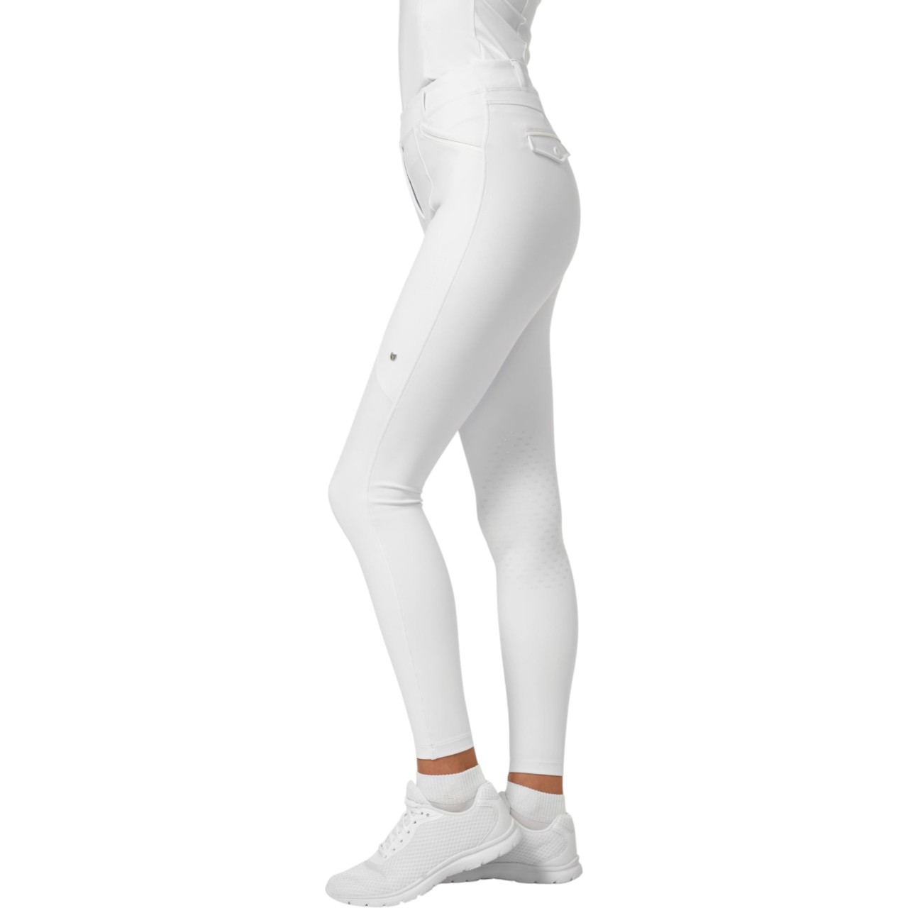 Mit ihrem modernen Schnitt und eleganten Weißton passen die Leggings perfekt zu verschiedenen Reitoutfits. Die integrierten Handytaschen sind nicht nur stilvoll platziert, sondern auch funktional dimensioniert. Dezente Markendetails aus Metall setzen edle Akzente, ohne aufdringlich zu wirken. Das schmutzabweisende Finish erleichtert dir die Pflege im Alltag. Ob im Stall, beim Training oder auf dem Turnier – diese Leggings erfüllen höchste Ansprüche an Stil und Leistung. Hergestellt aus einem hochwertigen, weichen Funktionsmaterial bieten sie ein luxuriöses Tragegefühl bei jeder Witterung.