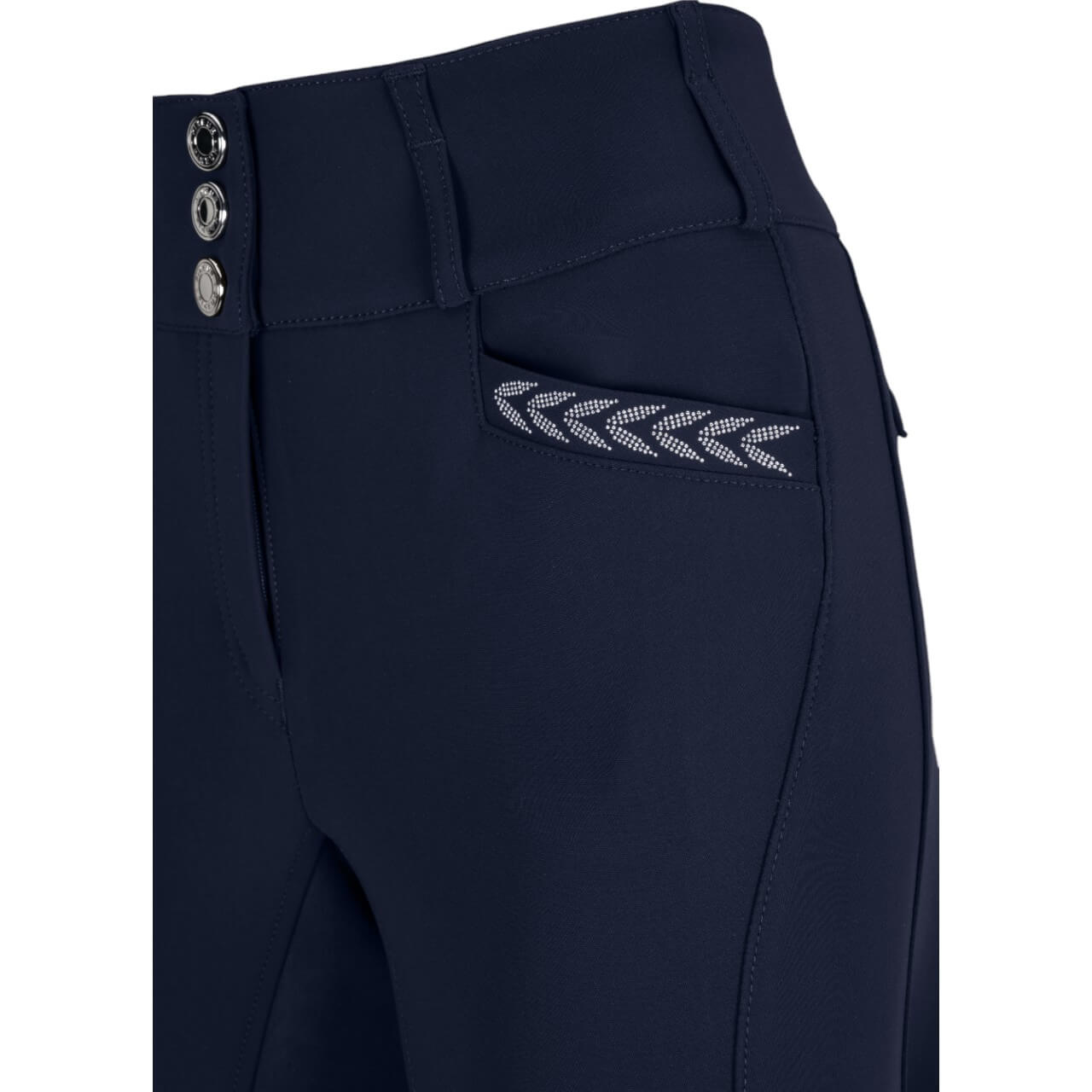 Die Reithose Damen New Candela Street FFL Full-Grip FS 2025 besticht durch ihre moderne Optik in edlem Night Blue. Elegante Strassapplikationen und ein metallisch glänzender Bundverschluss setzen stilvolle Akzente. Die seitliche Handytasche sorgt für zusätzlichen Komfort und Praktikabilität während des Reitens. Der gesäumte Beinabschluss bietet einen glatten Übergang in die Reitstiefel.
