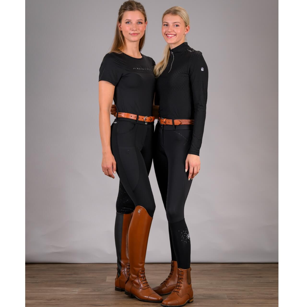 Die Cavalcecilia FS 2025 besticht durch ihr elegantes Design, das mit funkelnden Kristallsteinen und einer stilvollen Nahtführung veredelt ist. Der Cavallo-Steigbügel-Print setzt dezente, aber wirkungsvolle Akzente, die nicht nur optisch, sondern auch funktional überzeugen – ideal für Reiterinnen, die Wert auf Ästhetik und Praktikabilität legen.