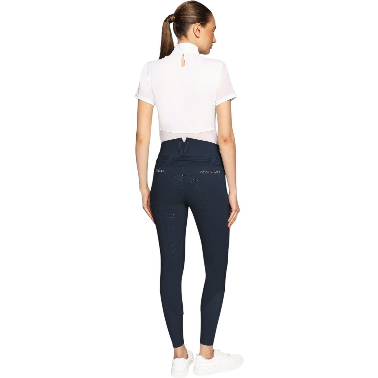 Die Reithose überzeugt durch eine besonders hohe Taille im Rückenbereich, die durch einen V-förmigen Schnitt und kontrastierende Nähte betont wird. Diese Schnittführung unterstützt eine stabile Haltung im Sattel und sorgt gleichzeitig für eine feminine Silhouette. Der Full-Grip Besatz bietet zuverlässigen Halt und fördert eine ruhige Beinlage beim Reiten. Dadurch unterstützt die Hose eine präzise Hilfengebung im Training oder im Parcours. Die ergonomische Passform sorgt für angenehmen Sitz ohne Druckstellen. Gleichzeitig bleibt die Bewegungsfreiheit bei jeder Reitdisziplin erhalten.