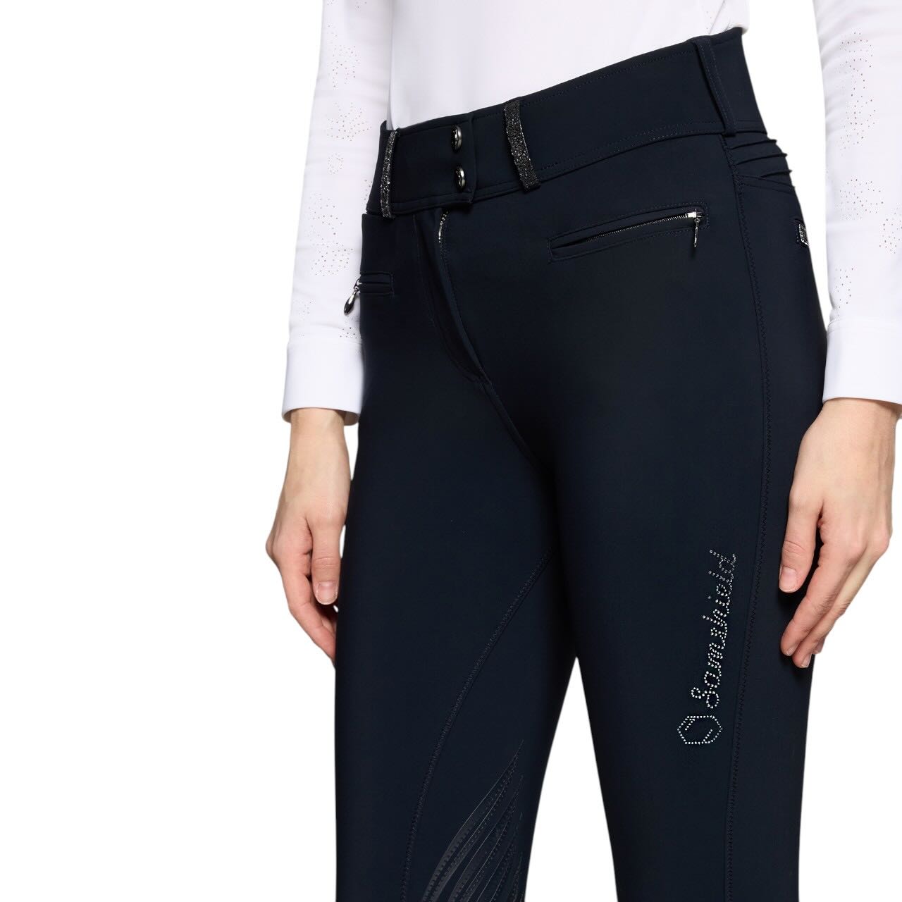 Edle Swarovski Crystal Fabric Einsätze an Gürtelschlaufen und Gesäßtaschen verleihen der Reithose einen stilvollen und hochwertigen Look. Ein funkelndes Samshield Swarovski-Logo am Oberschenkel setzt einen dezenten Markenakzent. Die charakteristische Samshield-Falte auf der Rückseite unterstreicht die elegante Linienführung des Designs. Zwei Reißverschlusstaschen bieten sicheren Stauraum für kleine Essentials. Zusätzlich sorgt eine unsichtbare Handytasche für praktische Funktion im Alltag. Damit verbindet die Claranova Reithose stilvolle Optik mit durchdachter Reitsport-Funktionalität.