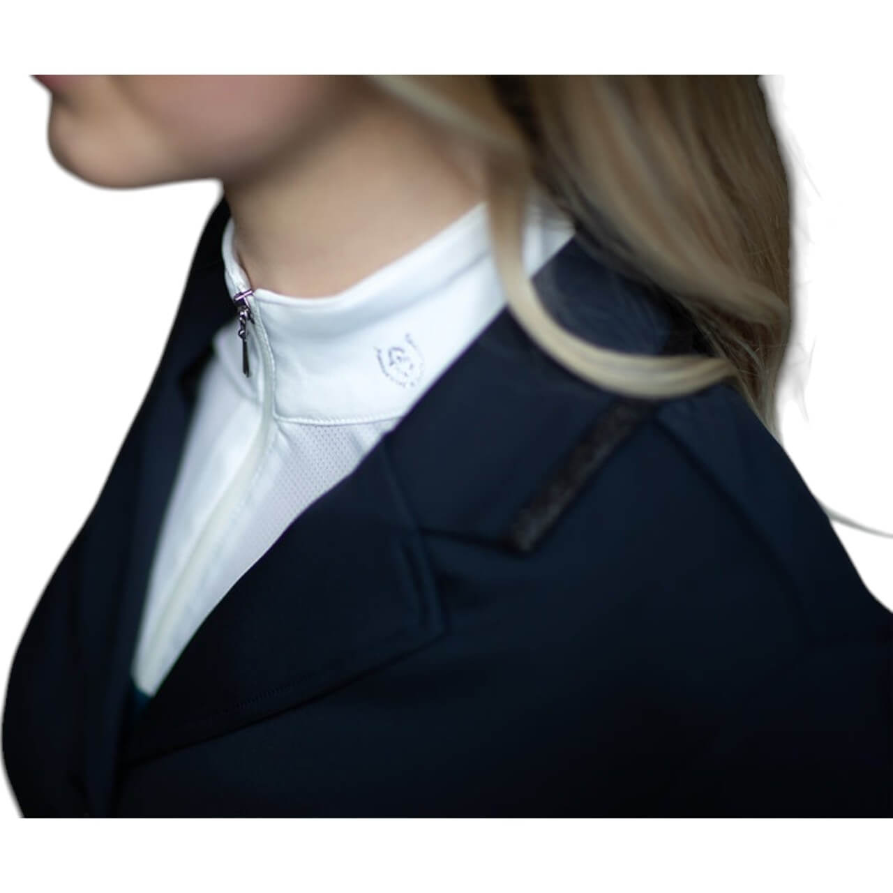 Strategisch platzierte Mesh-Einsätze auf Vorder- und Rückseite sowie am oberen Rücken sorgen für eine angenehme Belüftung. Sie bleiben auch bei sommerlichen Temperaturen kühl und leistungsfähig. Das atmungsaktive Mesh ist leicht und dennoch robust – ideal für anspruchsvolle Turniertage. Die Einsätze verlaufen vom Reißverschluss an der Taille bis zur Naht unter dem Arm und bieten eine effektive Luftzirkulation. Gleichzeitig bleibt die stilvolle Optik der Jacke durchdacht erhalten. Glitzernde schwarze Details setzen dezente Akzente, ohne aufdringlich zu wirken.