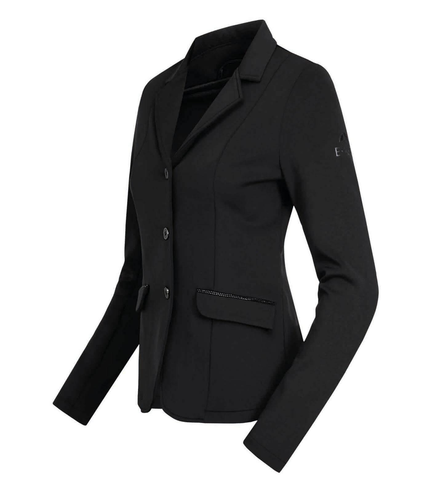 Das Turnierjacket Lina besticht durch seine elegante, taillierte Passform und die klassischen Farben Schwarz und Tiefblau. Die dekorativen Strasssteine an den Taschen verleihen dem Jacket einen Hauch von Glamour, während die zwei seitlichen Eingrifftaschen praktische Funktionen bieten. Ein unverzichtbares Kleidungsstück für jeden Reiter, das sowohl auf dem Turnierplatz als auch im Alltag überzeugt.