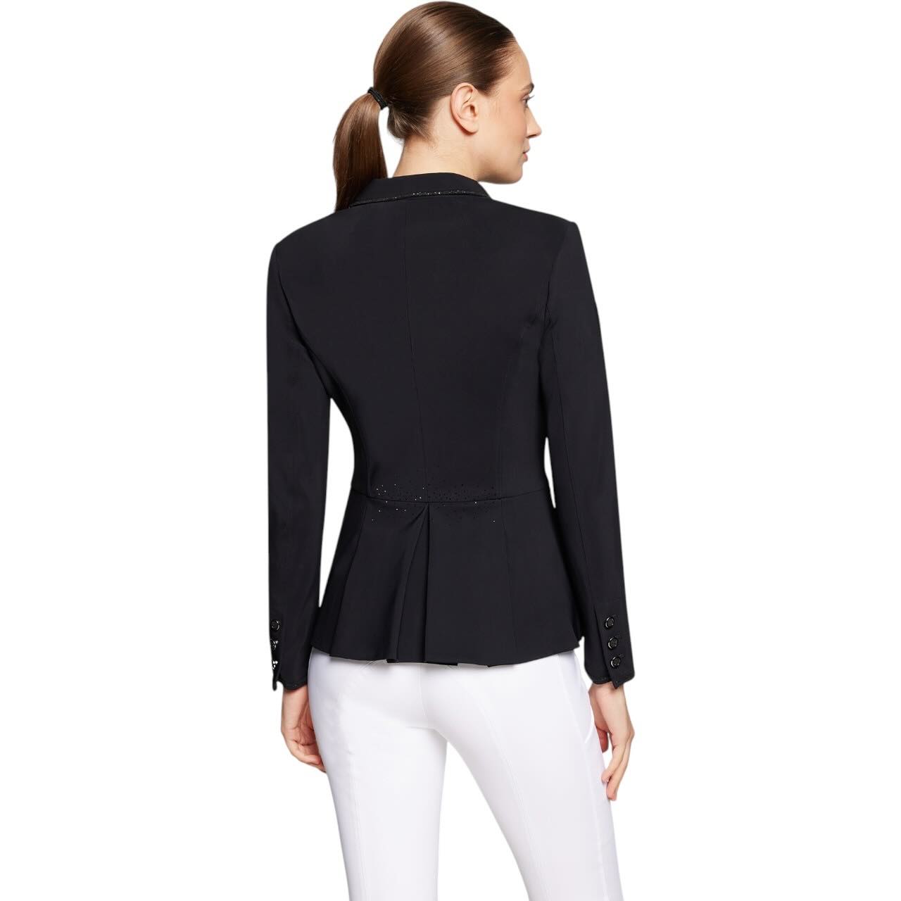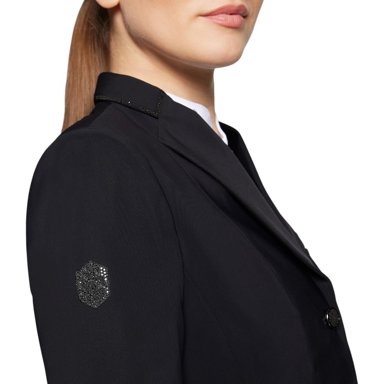 Das Victorine Crystal Fabric Jackett begeistert durch seine kürzere, taillierte Schnittführung, die deine Silhouette elegant unterstreicht. Auf dem Schulterbereich setzt ein eingearbeitetes Kristallwappen stilvolle Akzente, während feinste Glitzersteine an Kragen, Knöpfen, Manschetten und Rückenpartie für einen dezenten Glamour sorgen. Die verdeckte Reißverschlussleiste hinter den drei vorderen Knöpfen sorgt für einen sauberen Look, auch bei Bewegung im Sattel. Dieses Jackett ist nicht nur optisch ein Highlight – es überzeugt auch im Detail durch seine durchdachte Verarbeitung.