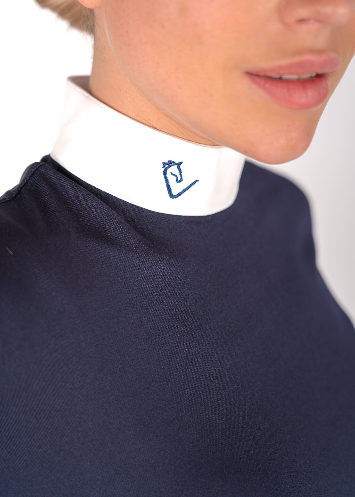 Das Turniershirt Damen Langarm Verdi besticht durch seine schlichte Eleganz in klassischem Navy. Der Kragen mit unsichtbarer Knopfleiste und dezentem Reißverschluss verleiht dem Shirt einen modernen Look. Der Netzstoff an der Armunterseite sorgt nicht nur für optische Akzente, sondern erhöht auch die Atmungsaktivität, sodass du bei jedem Turnier frische Eleganz ausstrahlst.