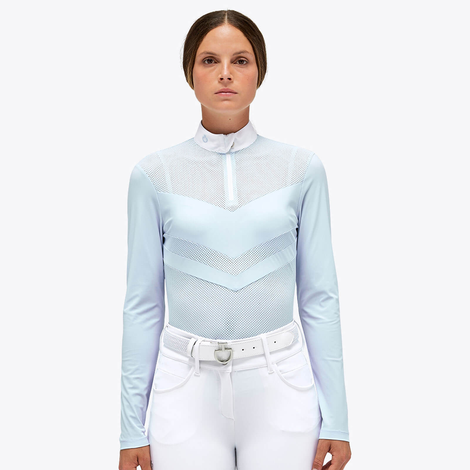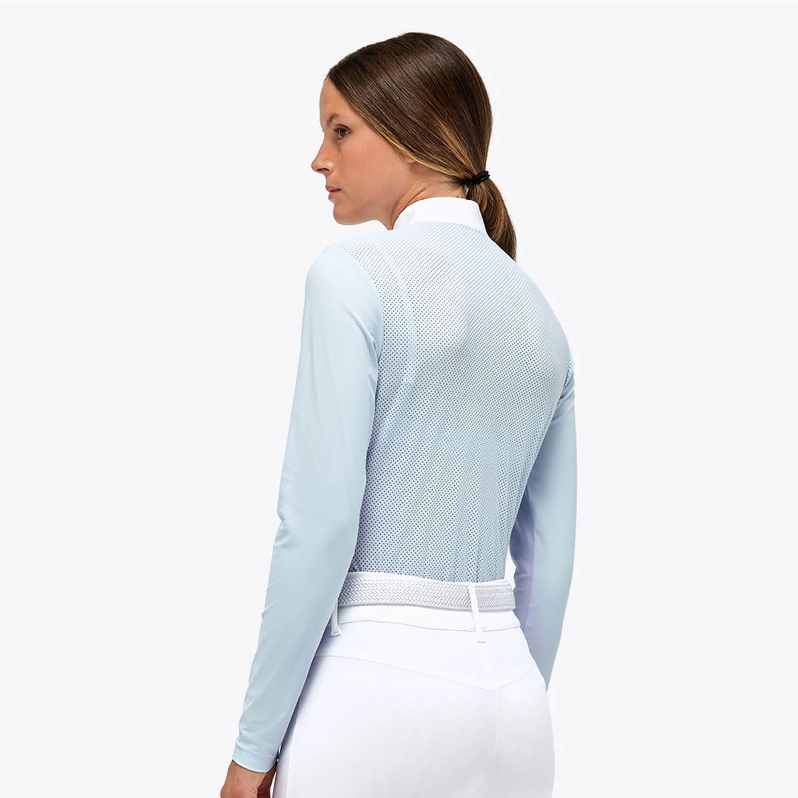 Das Langarmshirt präsentiert sich in der dezenten und dennoch eleganten Farbe Powder Blue, die jedem Reitoutfit eine exklusive Note verleiht. Der Reißverschluss bis zur Brust sorgt nicht nur für Funktionalität, sondern auch für ein modernes Erscheinungsbild. Dank der perforierten Jersey-Struktur bietet das Shirt nicht nur optische Finesse, sondern auch optimale Belüftung.