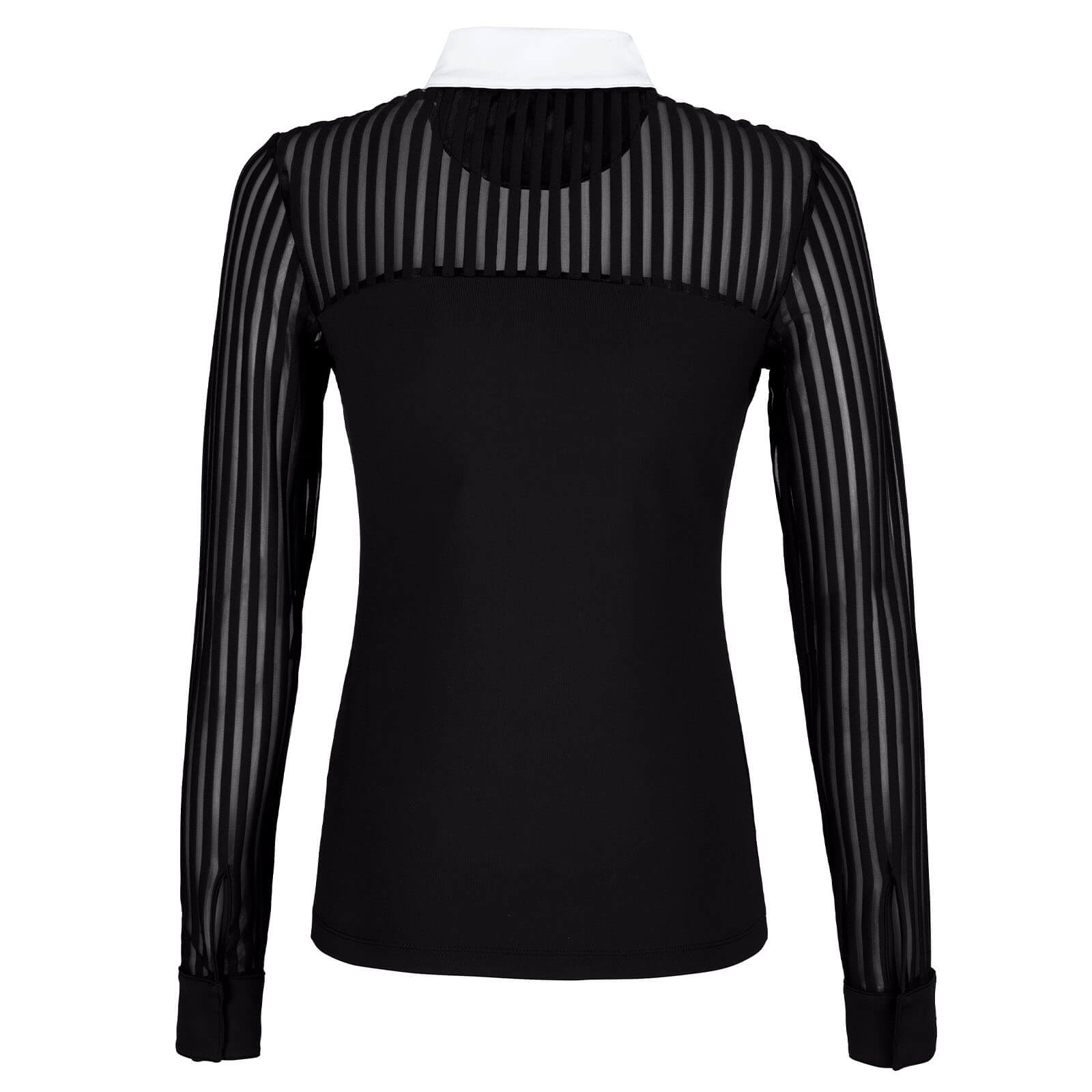 Die Turnierbluse besticht durch ihre edlen gestreiften Mesh-Details und die elegante Rhinestones-Applikation, die für einen glanzvollen Auftritt sorgt. Die dezente, verdeckte Knopfleiste und die kunstvoll gestalteten Ärmelmanschetten verleihen diesem Shirt eine zeitlose Klasse. So bist du jederzeit perfekt gestylt.