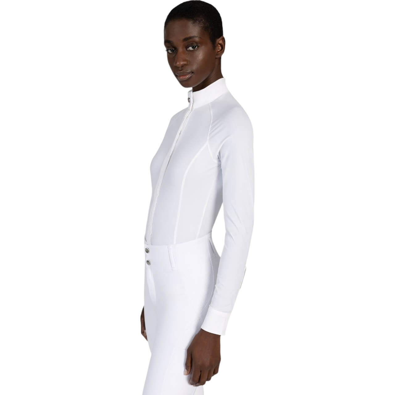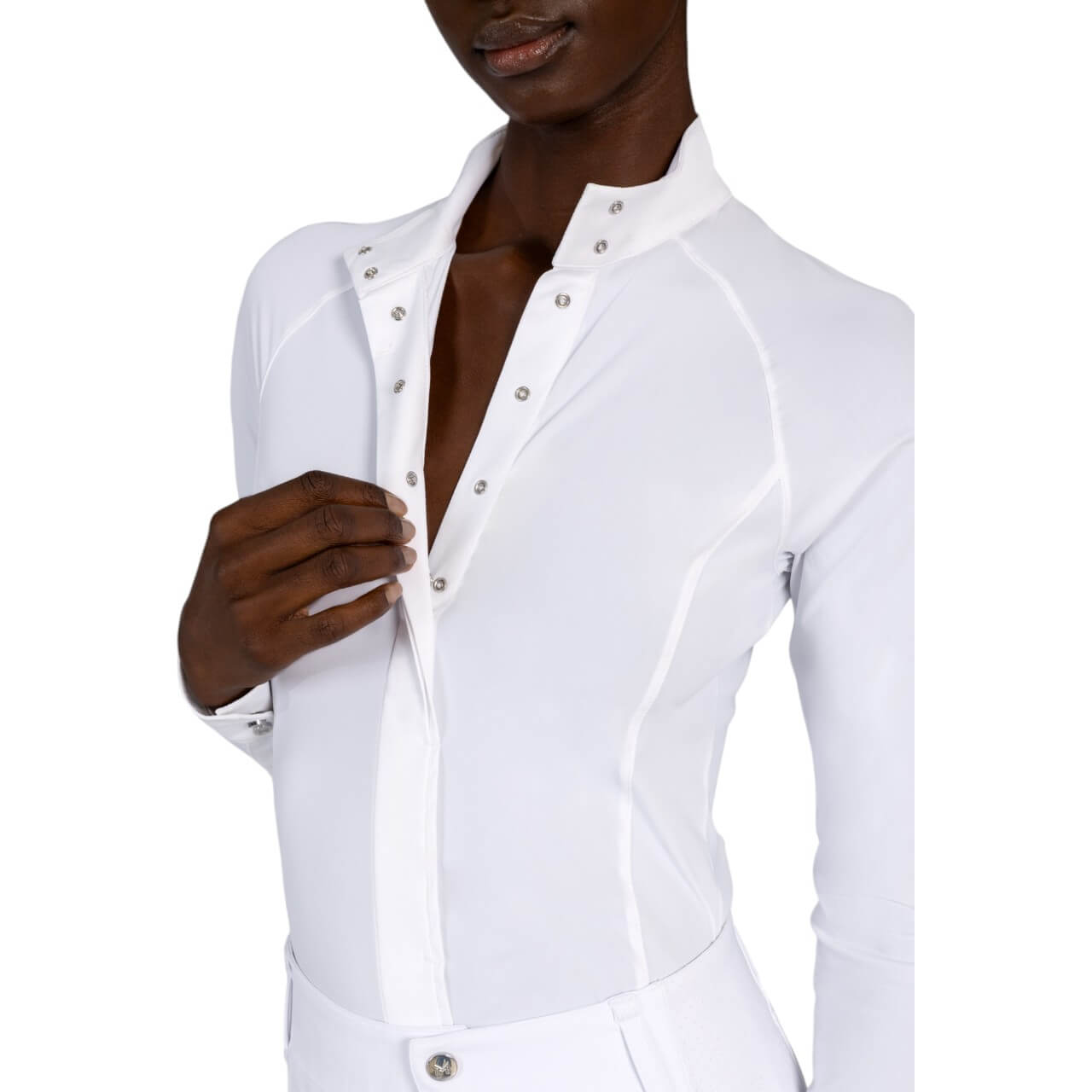 Dank der innovativen Easy-Click-Knöpfe vom Kragen bis zur Brust wirkt das Shirt wie ein klassisches Hemd, bleibt jedoch während der gesamten Prüfung perfekt geschlossen. Eine zusätzliche Schlaufe an der Rückseite des Kragens hält das Plastron sicher an Ort und Stelle. So bist du bestens vorbereitet – ob im Dressurviereck oder beim Springparcours.