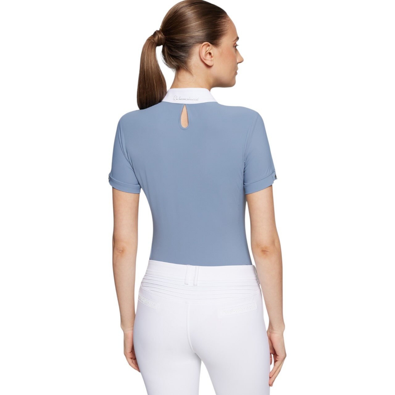 Optisch überzeugt das Shirt mit einer stilvollen und modernen Turnierästhetik. Die weiße V-förmige Frontpartie sorgt für einen klassischen Look im Sattel. Ein dezenter, unsichtbarer Half-Zip erleichtert das An- und Ausziehen. Der tropfenförmige Rückenschlitz verbessert zusätzlich die Belüftung. Am Kragen setzt ein Samshield-Blason-Rivet einen eleganten Akzent. Abgerundet wird das Design durch das Samshield-Logo mit edlen Swarovski® Kristallen.