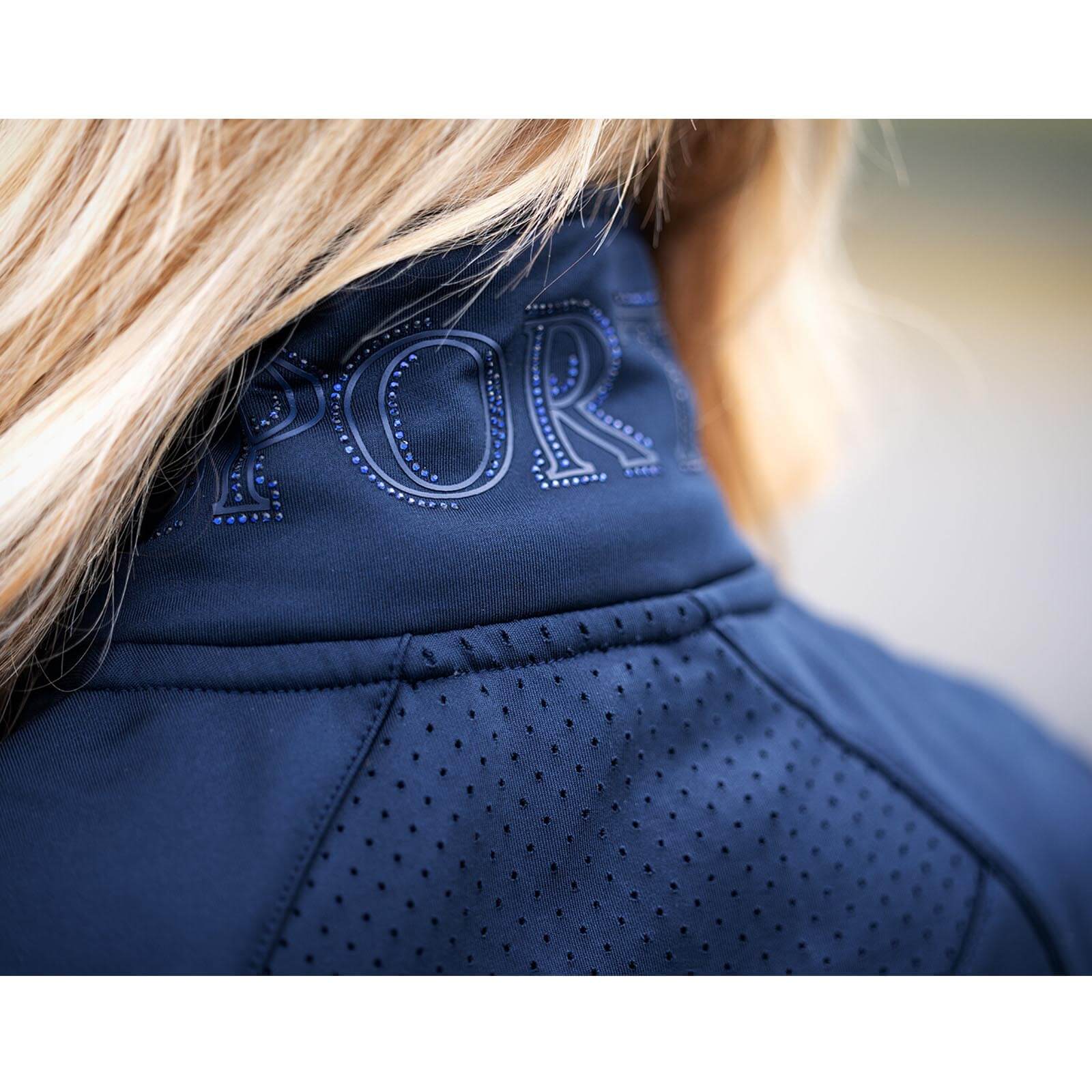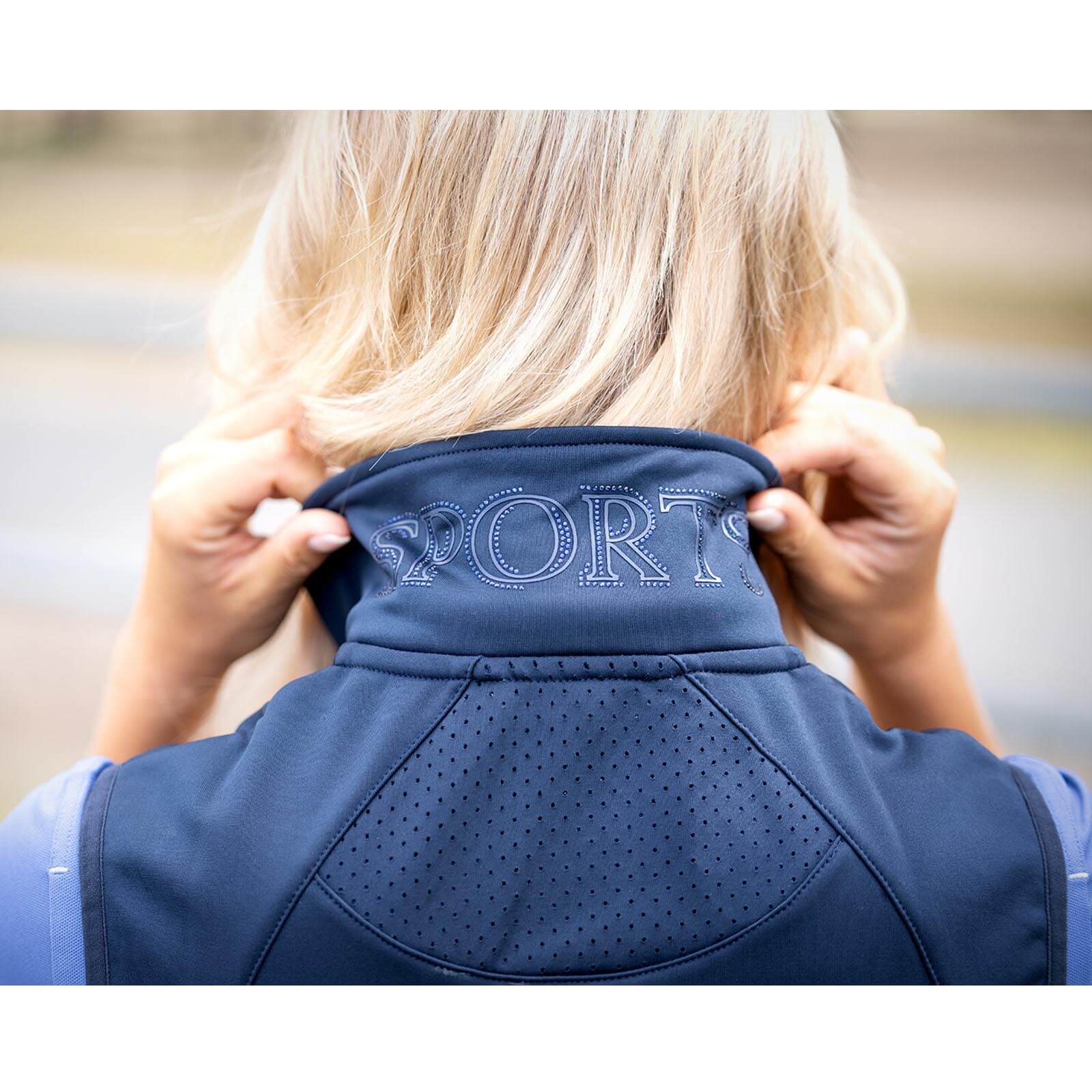 Die Weste Damen Harriet Style besticht durch ihr elegantes Design in Dark Blue, das jeder Reitgarderobe schmeichelt. Die schmeichelnden Teilungsnähte und der tonale Rubberprint mit Strass-Steinen am hinteren Kragen verleihen der Weste eine exklusive Note. Dank des elastischen Tapes an Armausschnitten und Saum bietet sie dir nicht nur Stil, sondern auch Komfort bei jedem Training.
