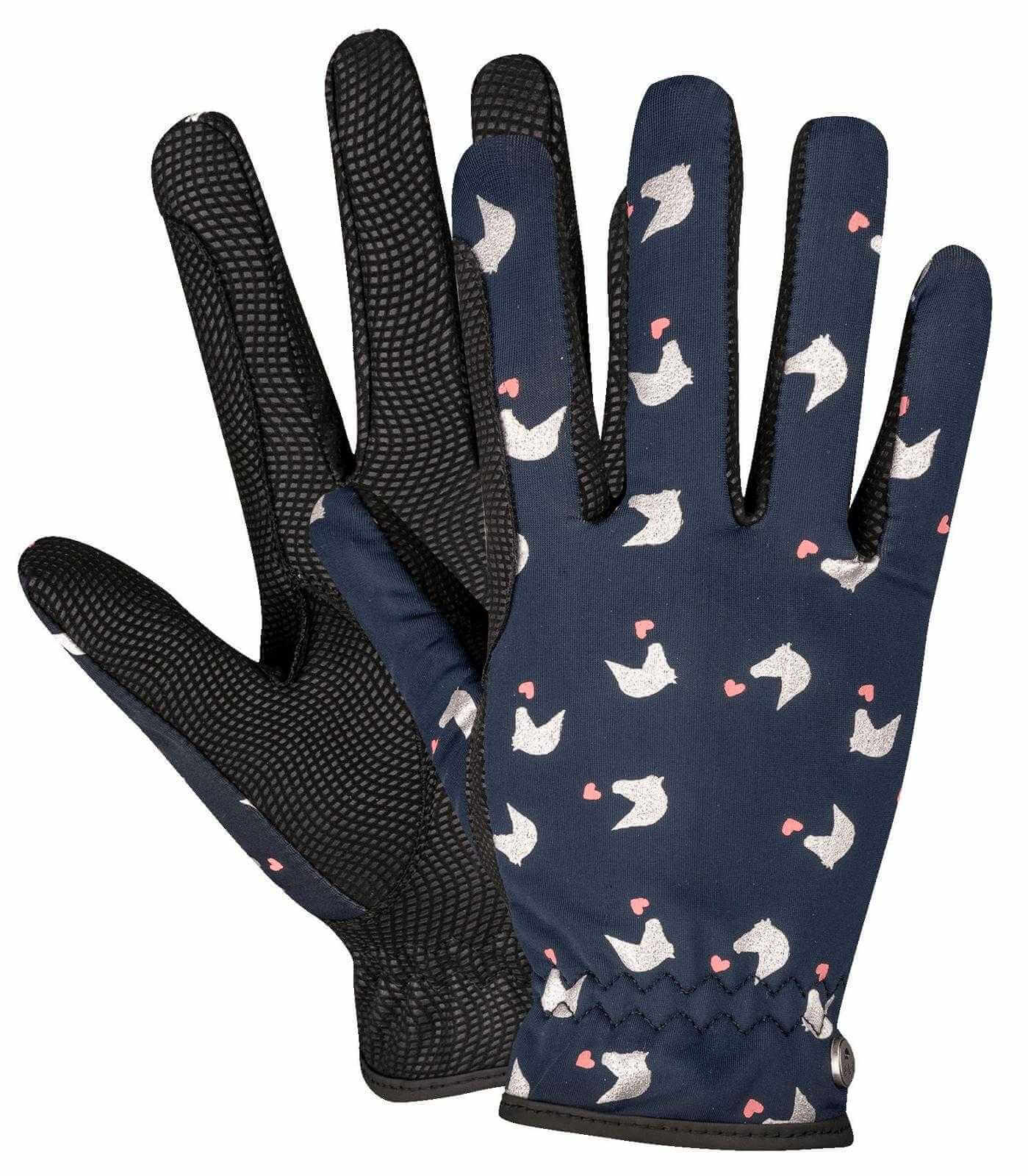 Der Reithandschuh Lucky Dora, Kids besticht durch sein ansprechendes Nachtblau mit Lucky Heart Print, das nicht nur gut aussieht, sondern auch für Wiedererkennung sorgt. Dank der elastischen Bündchen passt er sich optimal an die Hand an und bietet dadurch hervorragenden Tragekomfort. Der stilvolle All-Over-Print kombiniert Ästhetik mit praktischen Vorteilen, indem er für eine rutschfeste Oberfläche sorgt.