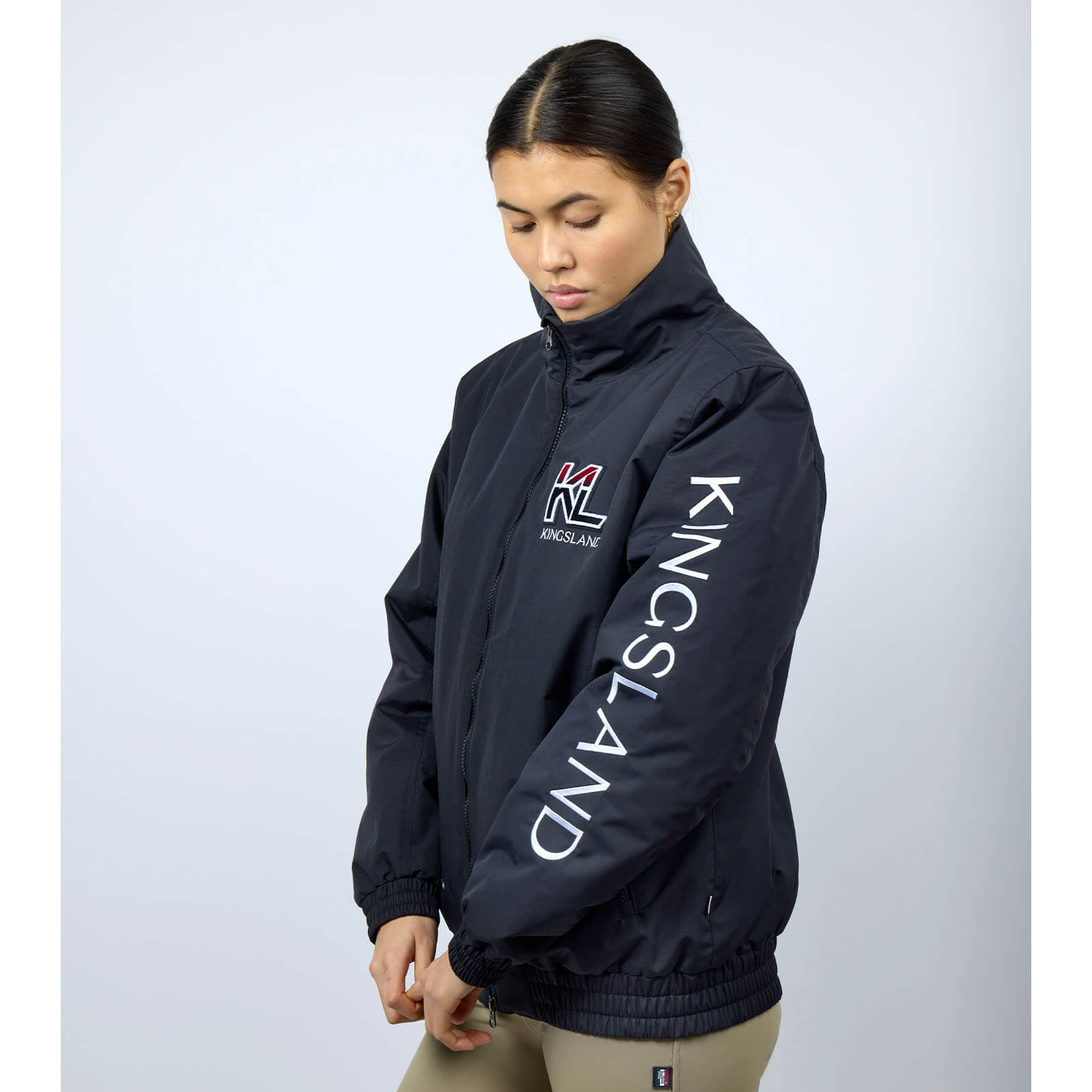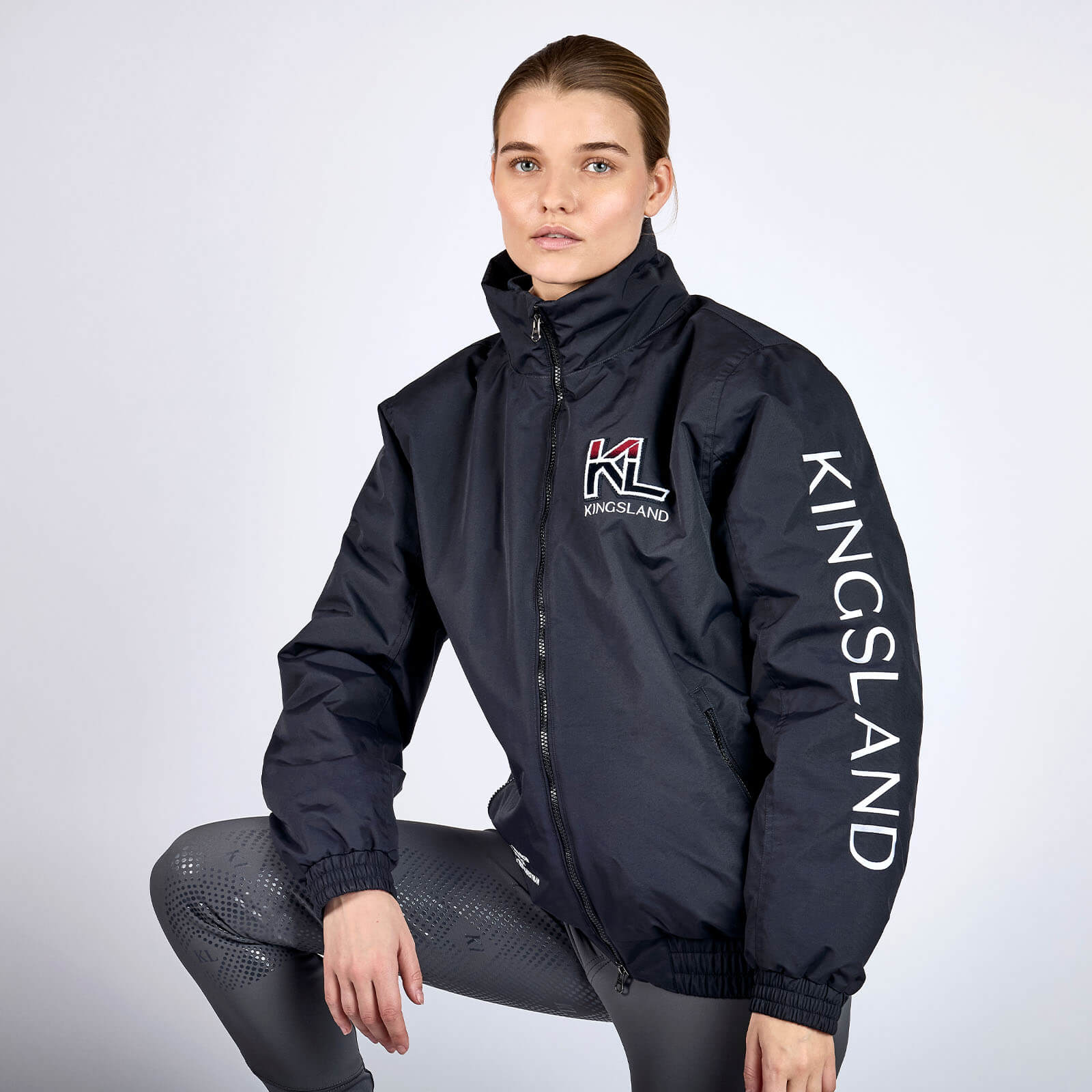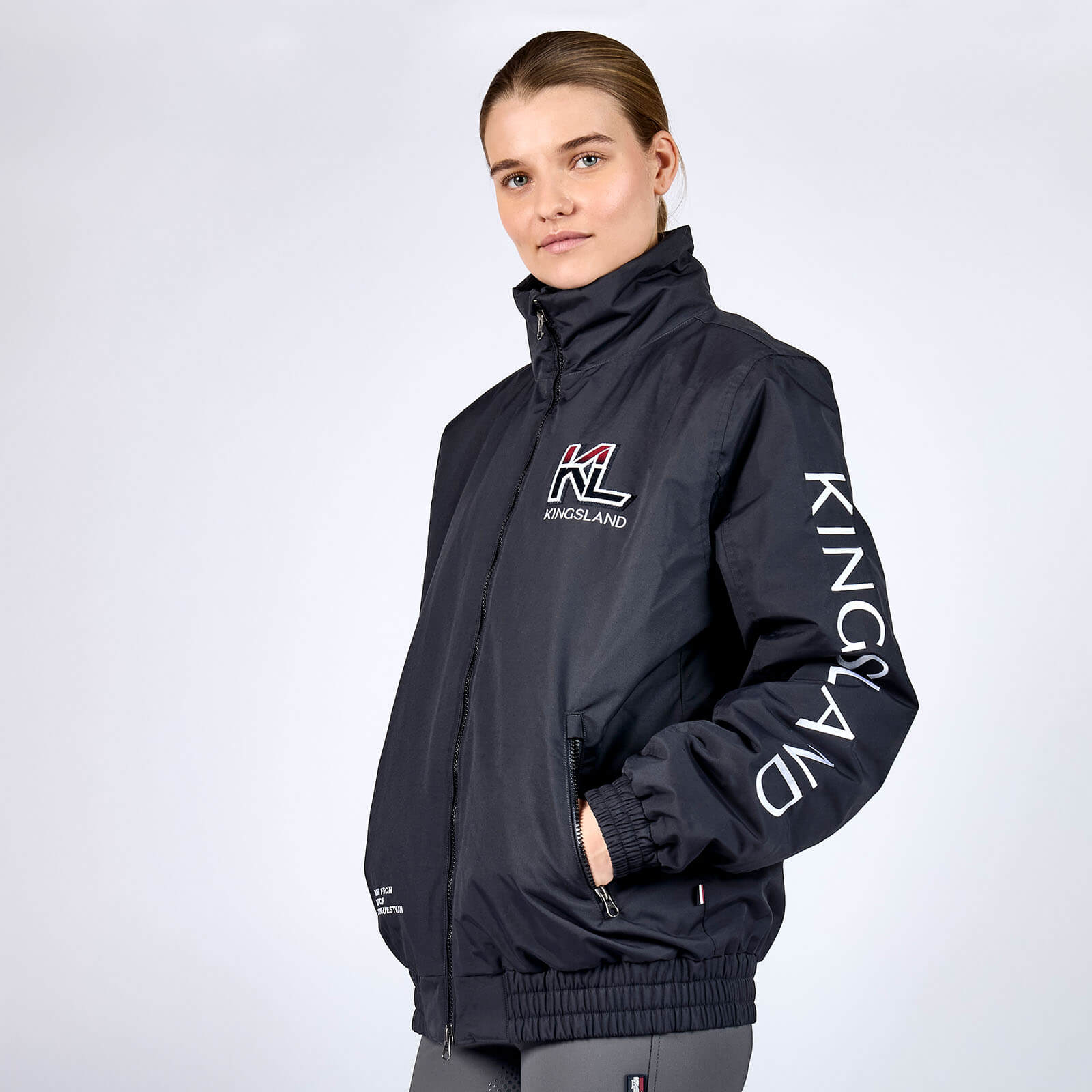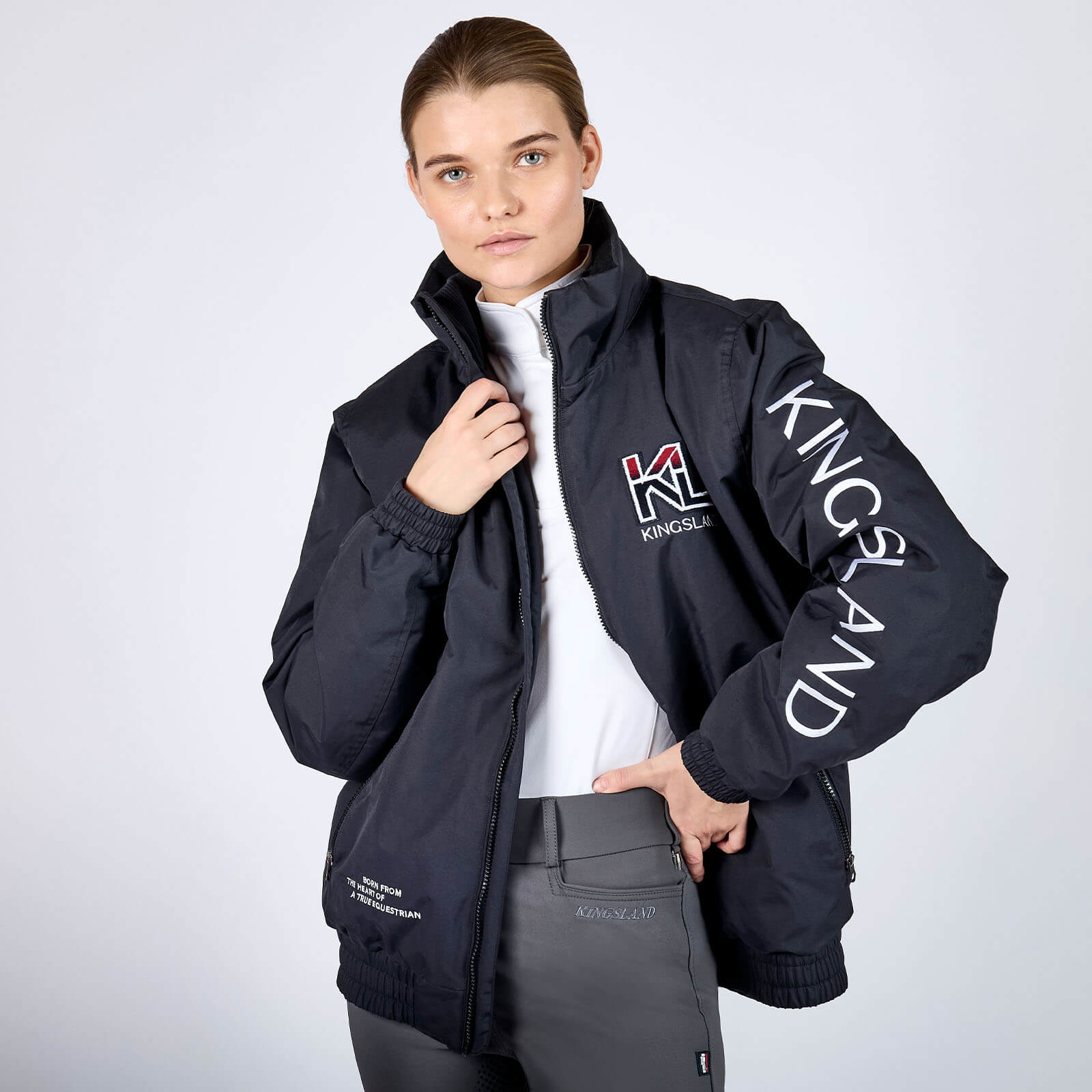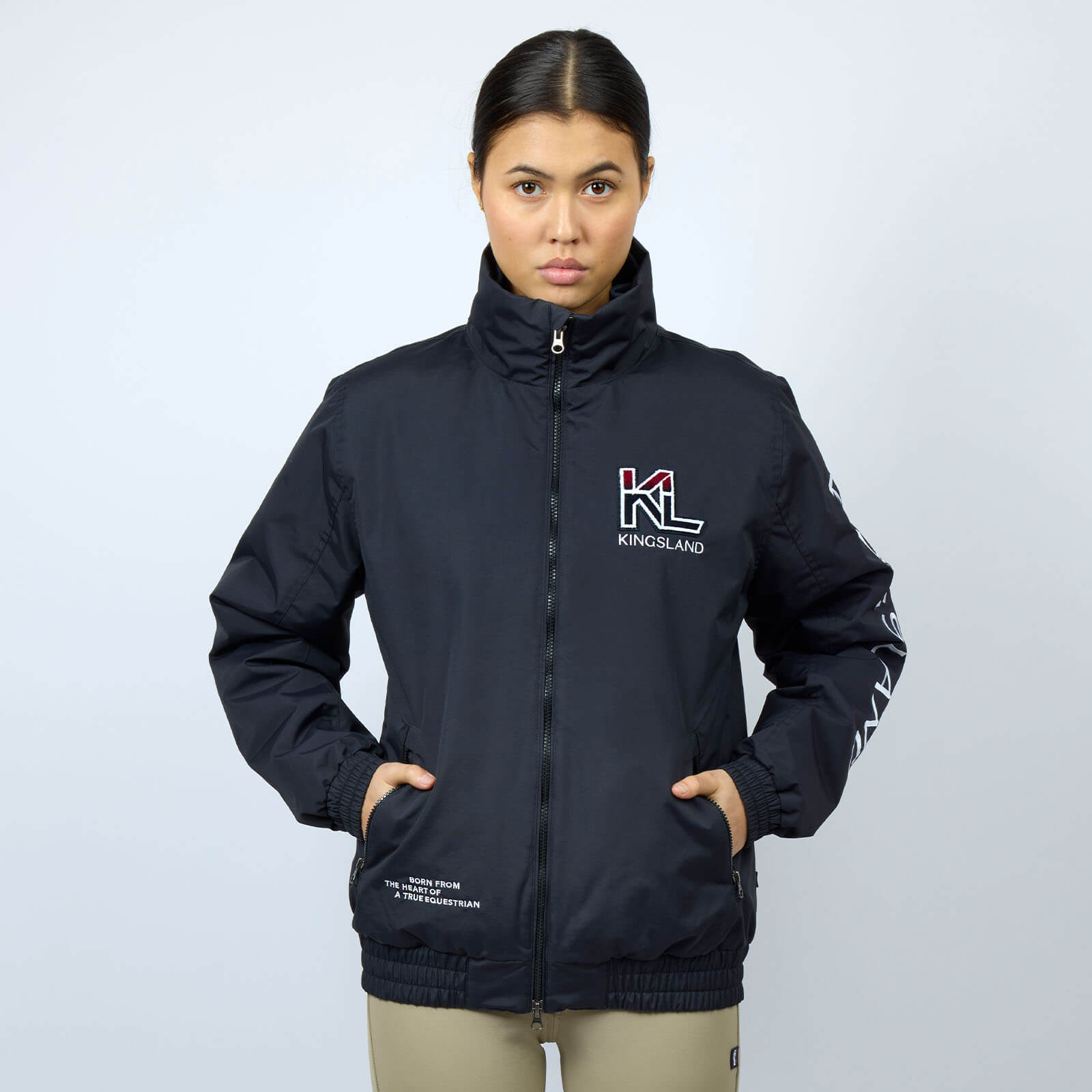 Die KLVayan Bomberjacke begeistert mit ihrem klassischen Navy-Ton und eleganten Design-Elementen. Der weiche Halsausschnitt und der erhöhte Kragen bieten nicht nur Schutz, sondern verleihen dir eine elegante Optik. Besonderes Highlight ist die „Born from the heart of a true equestrian“-Stickerei, die die Liebe zum Reitsport unterstreicht.