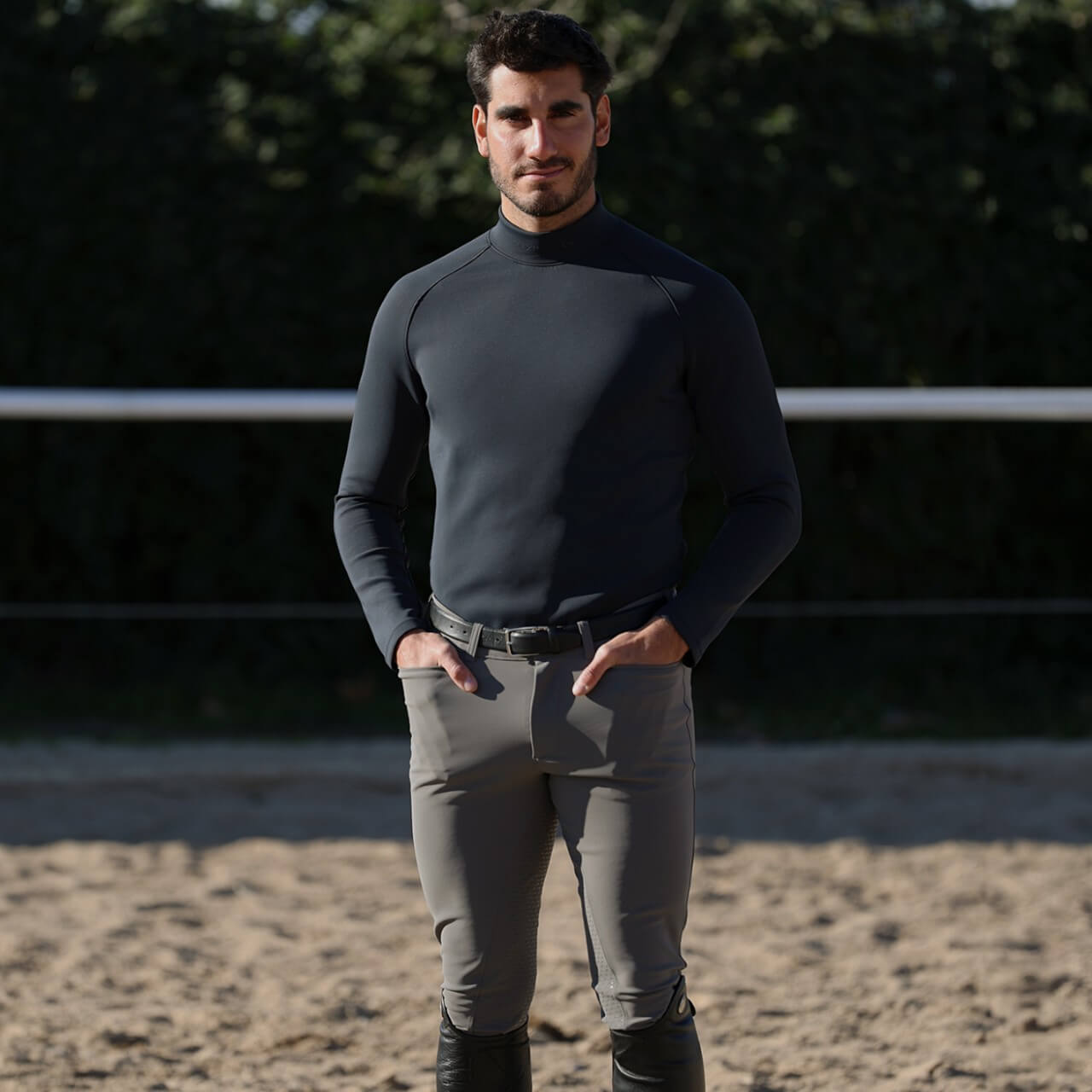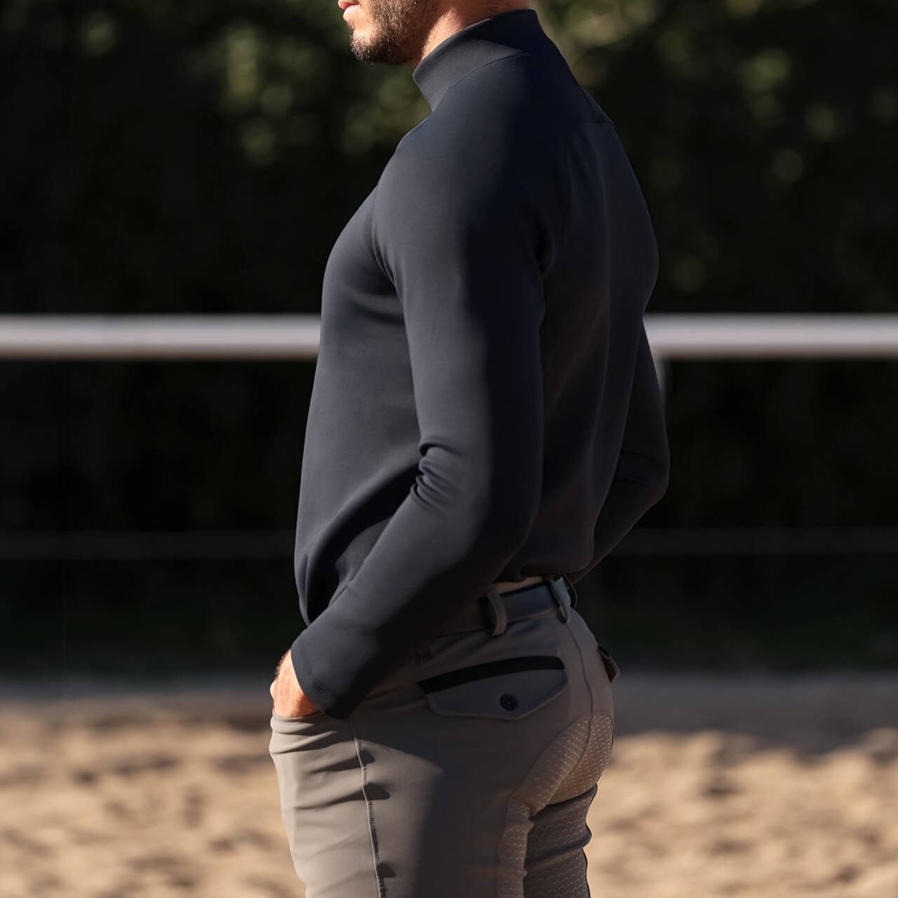 Das Herren Funktionsshirt Terra Base Layer besticht durch sein minimalistisches Design in den eleganten Farben Navy und Taupe, das sich mühelos in jede Reitgarderobe einfügt. Der figurnahe Schnitt sorgt für eine stilvolle Silhouette, während der mittelhohe Kragen dich vor Wind und Kälte schützt. Trage es als Basisschicht oder eigenständig als modisches Statement.