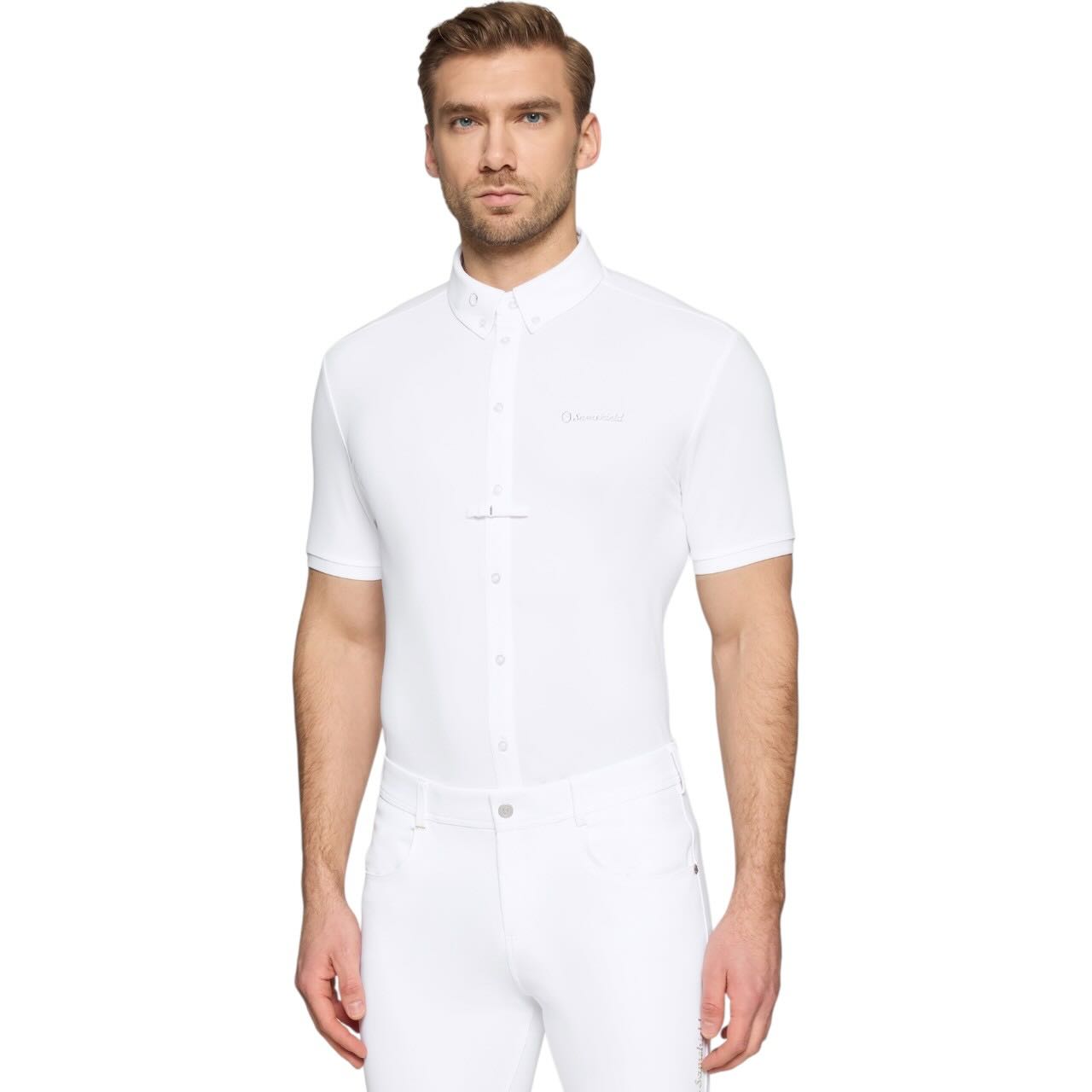 Optisch überzeugt das Shirt durch stilvolle Kontrastdetails und eine moderne, sportliche Linienführung. Der weiße Kragen verleiht dem Oberteil einen klassischen Turnier-Look. Eine integrierte Schlaufe ermöglicht das einfache Durchführen einer Turnierkrawatte. Der verdeckte Half-Zip wird elegant hinter kontrastierenden Knöpfen verborgen. Auf dem Kragen befindet sich das kontrastierende Samshield-Blazon als hochwertiges Stickdetail. Das dezente Samshield-Logo auf der Brust unterstreicht den exklusiven Charakter des Shirts. Dadurch eignet sich das Modell sowohl für Training als auch für den Einsatz auf Turnieren.