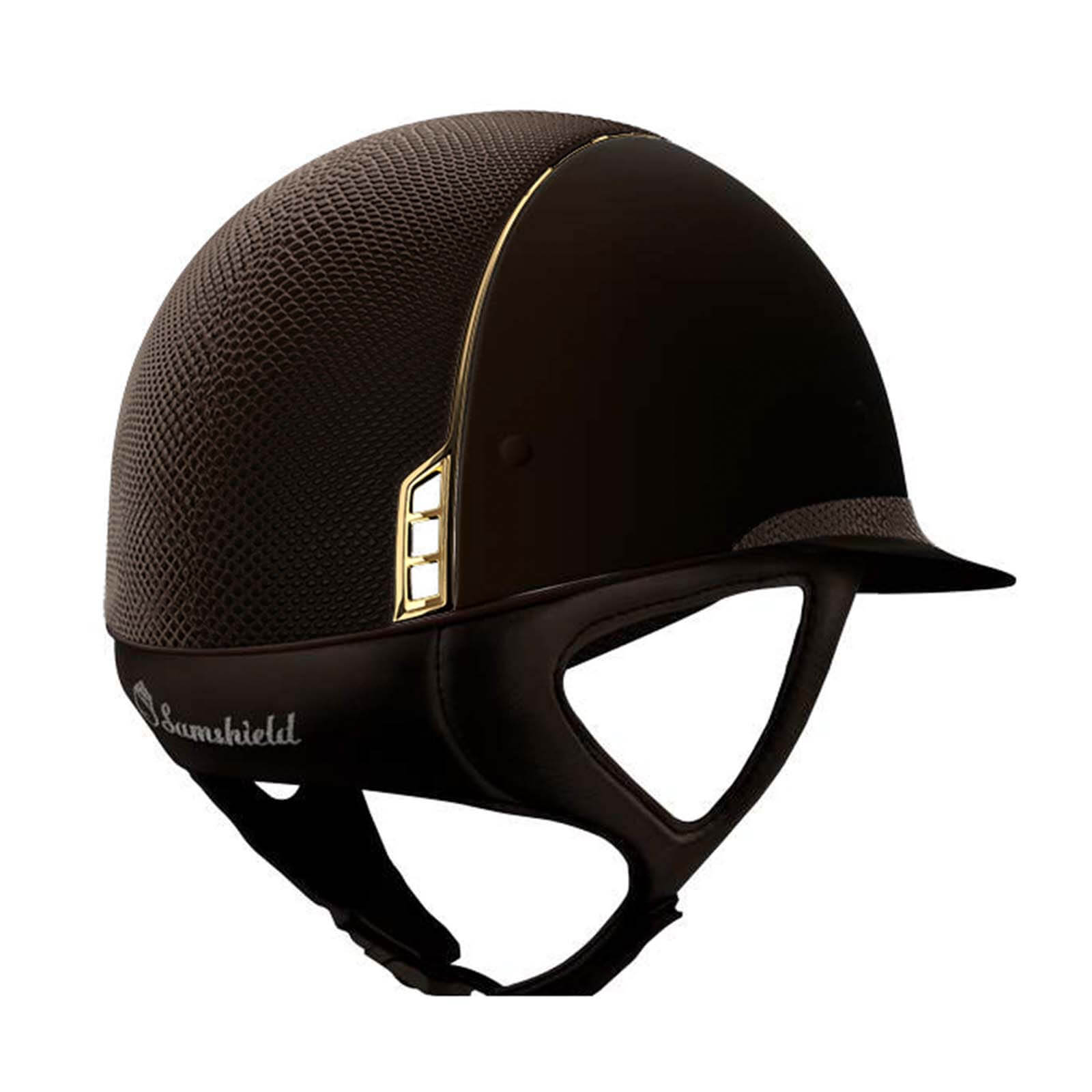 Reithelm Miss Shield Shadowmatt Brown Lizard Chrome Gold von Samshield vereint stilvolles Design mit höchstem Schutz. Dieser exklusive Reithelm bietet dir ein einzigartiges Tragegefühl und kombiniert edle Materialien mit moderner Technologie, um dir im Sattel ein sicheres und komfortables Erlebnis zu garantieren.