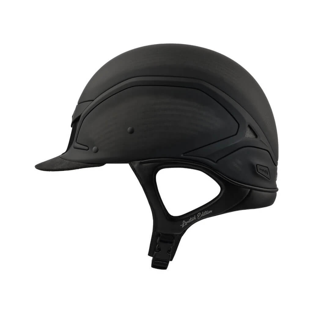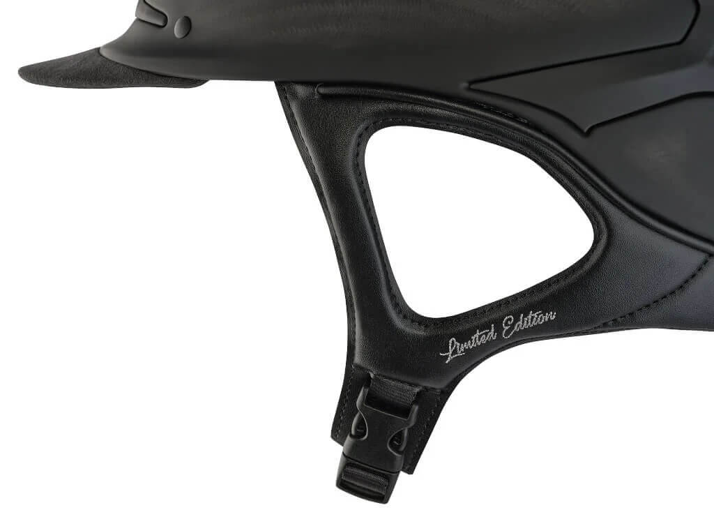 Der Reithelm XJ Dark Line beeindruckt mit einer edlen, matten Carbon-Hartschale, die optional auch in glänzendem Finish erhältlich ist. Die matten Details der neuen Dark Line verleihen dem Helm eine exklusive Optik, die auf jedem Turnier für Aufsehen sorgt. Dank der aerodynamischen Form und der präzisen Verarbeitung fügt sich der Helm nahtlos in dein Reitoutfit ein und bietet gleichzeitig optimalen Schutz.
